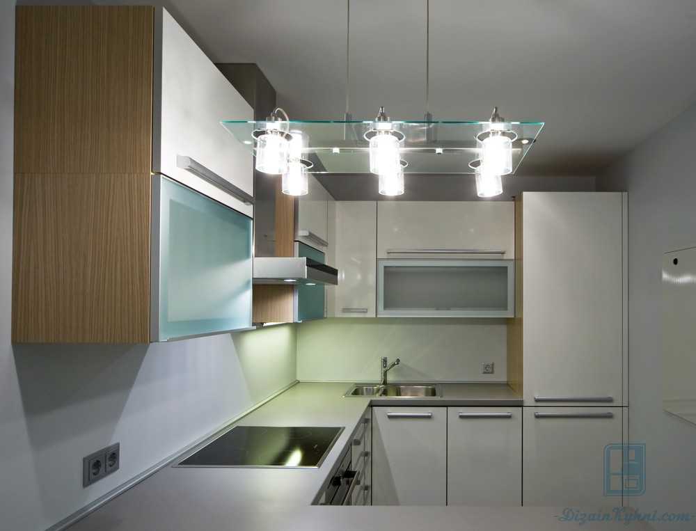 - Общее освещение. Это один или несколько встроенных в потолок источников света, обычно одна подвесная лампа с большим плафоном или с несколькими рожками. Но такое освещение сосредоточено в центре и не попадает в основную рабочую зону. Поэтому его нужно дополнить светом для места готовки. Таким исполнением наделены почти все угловые кухни в современном стиле 2021 г.