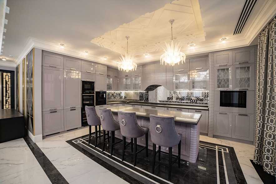 - Просторная кухня. Пожалуй, самый популярный вариант кухни в частном доме. Самое сложное ‒ определиться с островом, ведь выбрать можно любой. Можно даже сам дизайн подобрать под размер и форму острова. Или оформить целый кухонный архипелаг, чтобы не ощущалось пустоты.