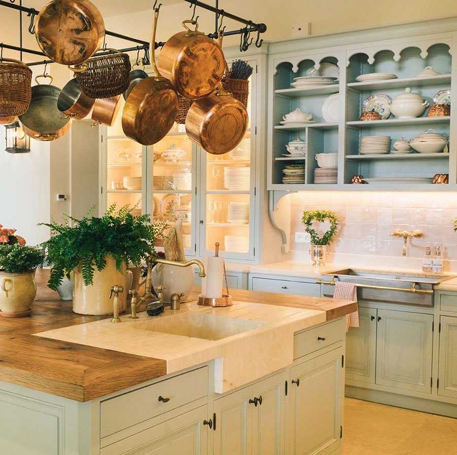 Романтичное направление делает кухню светлой и уютной. В ней присутствует много декорированных деталей и текстиля. Главный материал — дерево. Конструкцию можно сделать открытой со множеством полочек для хранения. На них гармонично будут смотреться небольшие занавески, которые сочетаются со стенами.