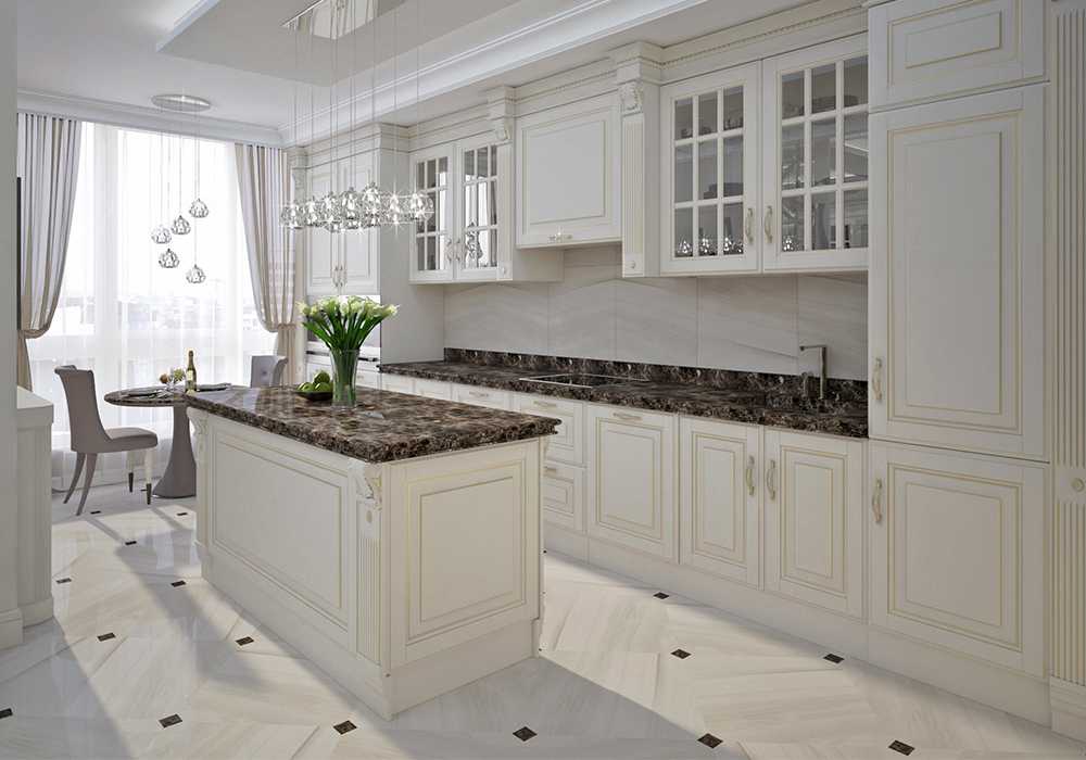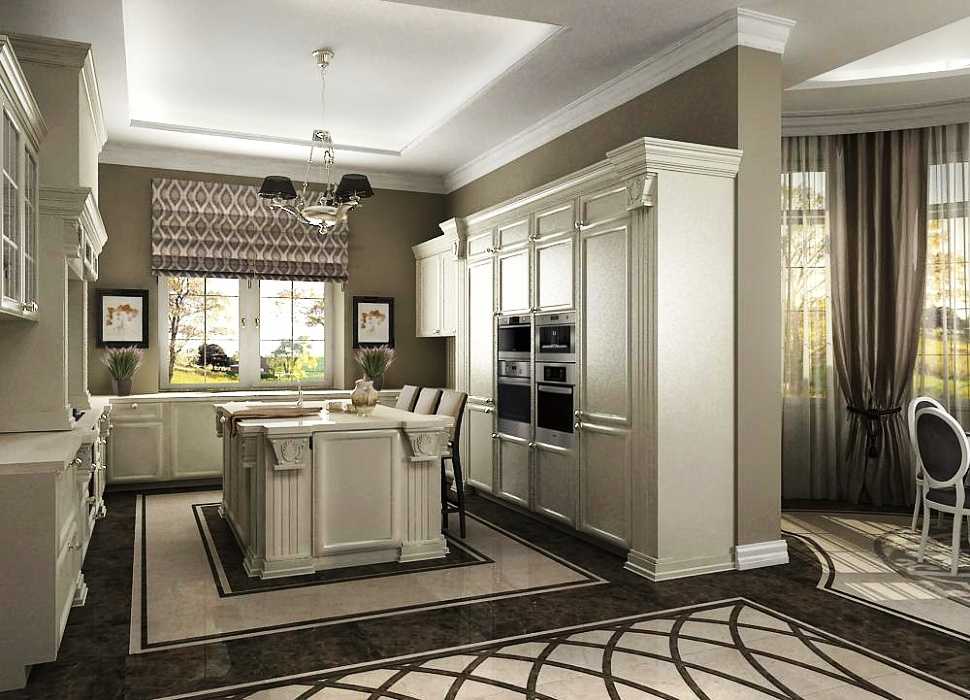 На просторной кухне устанавливают большой остров. Как правило, здесь оборудуют две рабочих поверхности, одна традиционная, вдоль стены, вторая параллельно ей на острове. В первой рабочей зоне остается плита, мойка, рабочая поверхность, на острове оборудуют разделочную и жарочную поверхности, вторую мойку. Обеденный стол может быть как продолжением рабочей зоны острова, так и устанавливаться отдельно. А про регулируемые ножки для кухни можно узнать здесь.