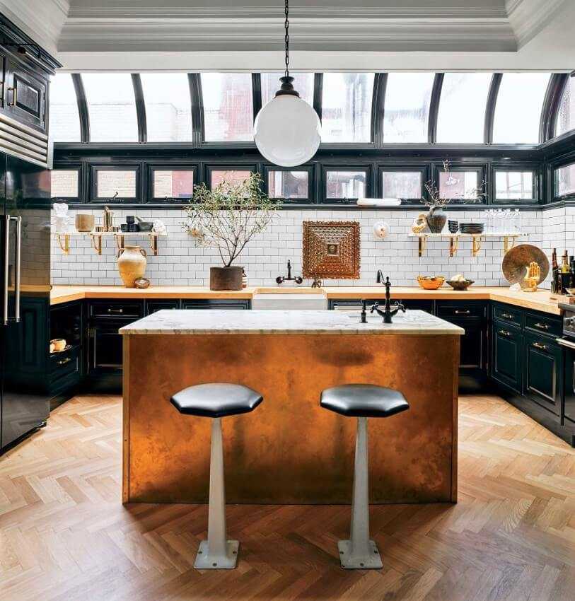 Острова нередко применяются в лофте. Обычно стиль выбирают, когда зал совмещен с кухней. Конструкция гармонично разделяет пространство. Столешница может быть сделана другим цветом, чтобы контрастировать с остальным гарнитуром. Так она становится элементом декора.