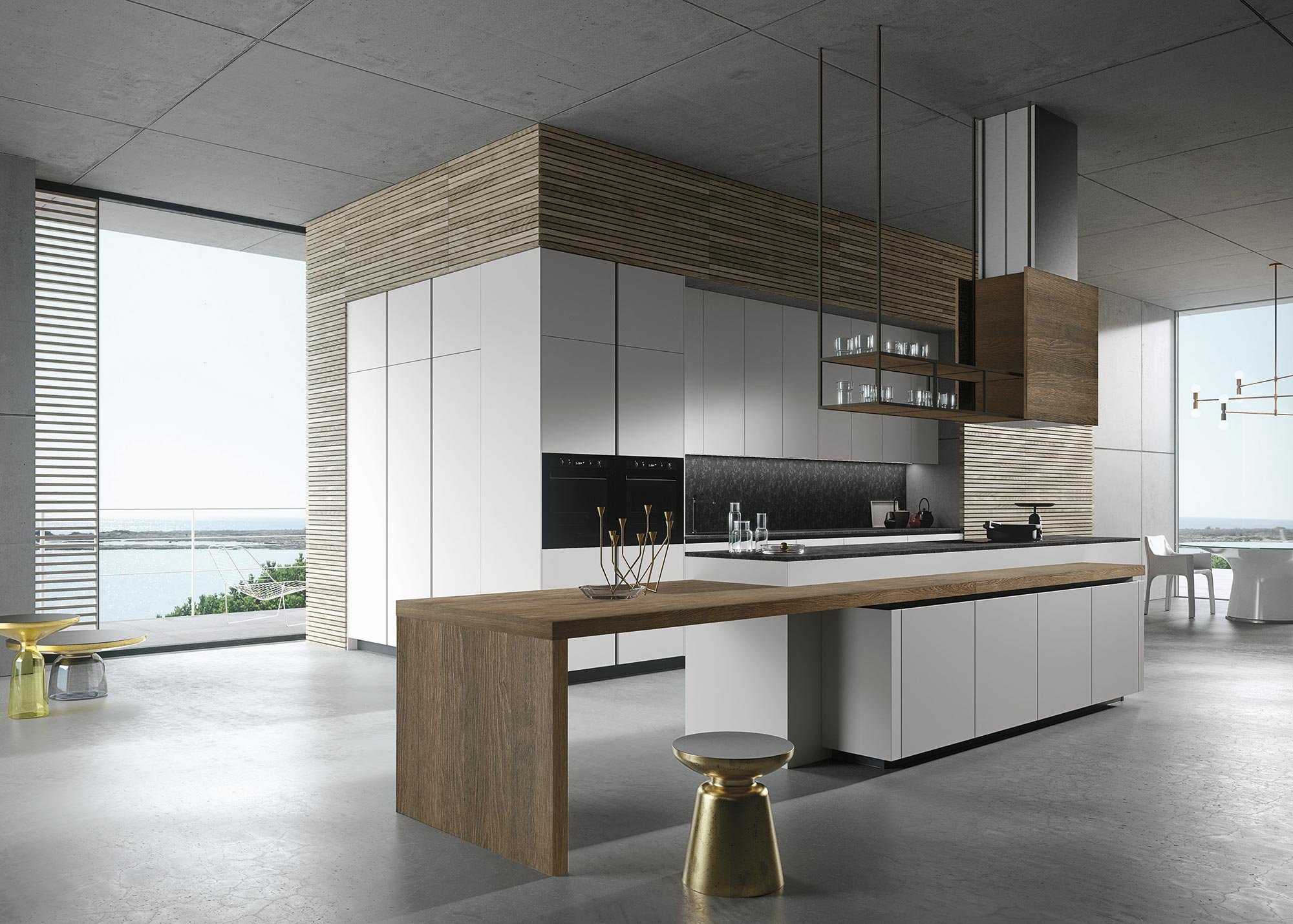 Кухня с островом в современном стиле, который включает некоторые элементы классики с добавлением технологичного минимализма. Применяются сдержанные формы, натуральные и искусственные материалы одновременно. Системы открывания дверей — выдвижные. Главные тона — черный, коричневый, бежевый, серый. В качестве легких акцентов выступают любые насыщенные цвета.