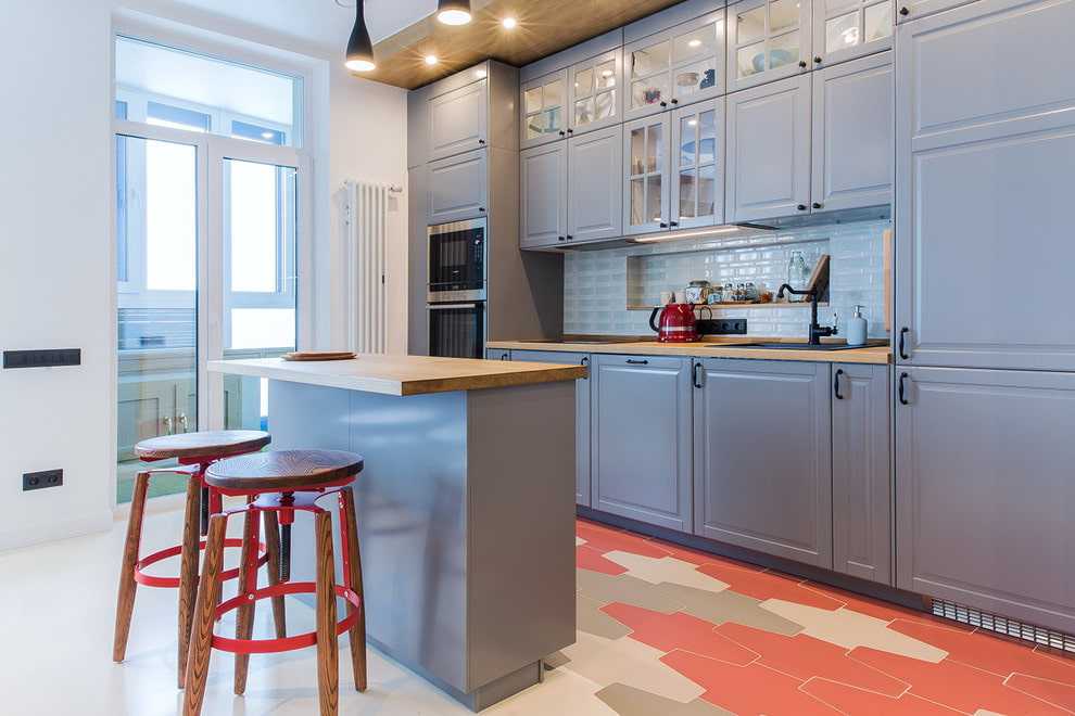Но есть и другой интересный прием: превратить остров в отдельный акцент. Тогда достаточно сохранить одну общую черту: например, форму и геометрию шкафов и столешницы. И можешь в свое удовольствие экспериментировать с цветами в свое удовольствие.