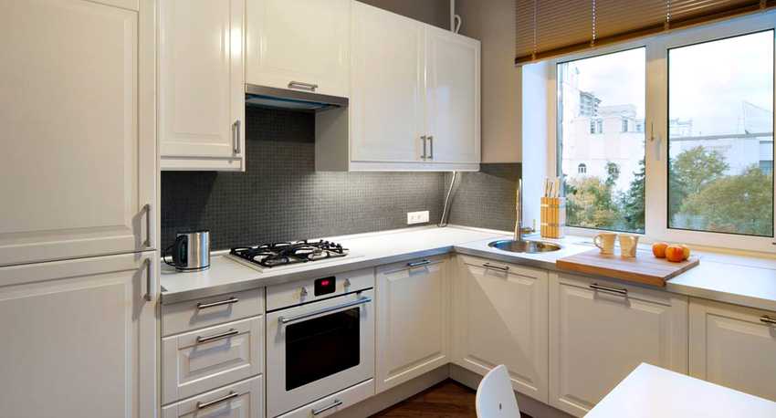 Совет! Если площадь кухни позволяет, можно установить угловой гарнитур вдоль окна. Такое решение отличается красотой и удобством, особенно если в кухне не единственное окно.