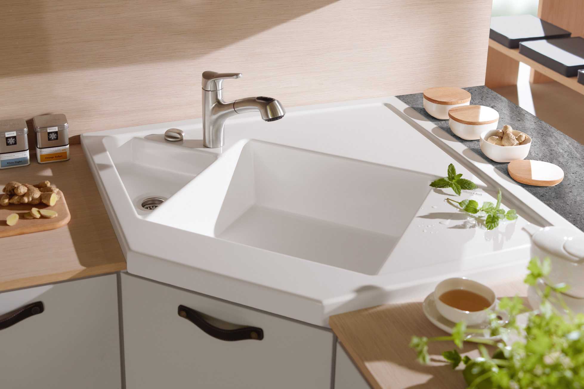 Она изготовлена в виде скошенной трапеции или треугольника, и такие типы моек лучше всего подойдут для помещений маленького размера (это касается кухонь в хрущевках). Угловые мойки для кухонь являются не самым удобным вариантом для мытья посуды, но зато здорово помогают экономить пространство.
