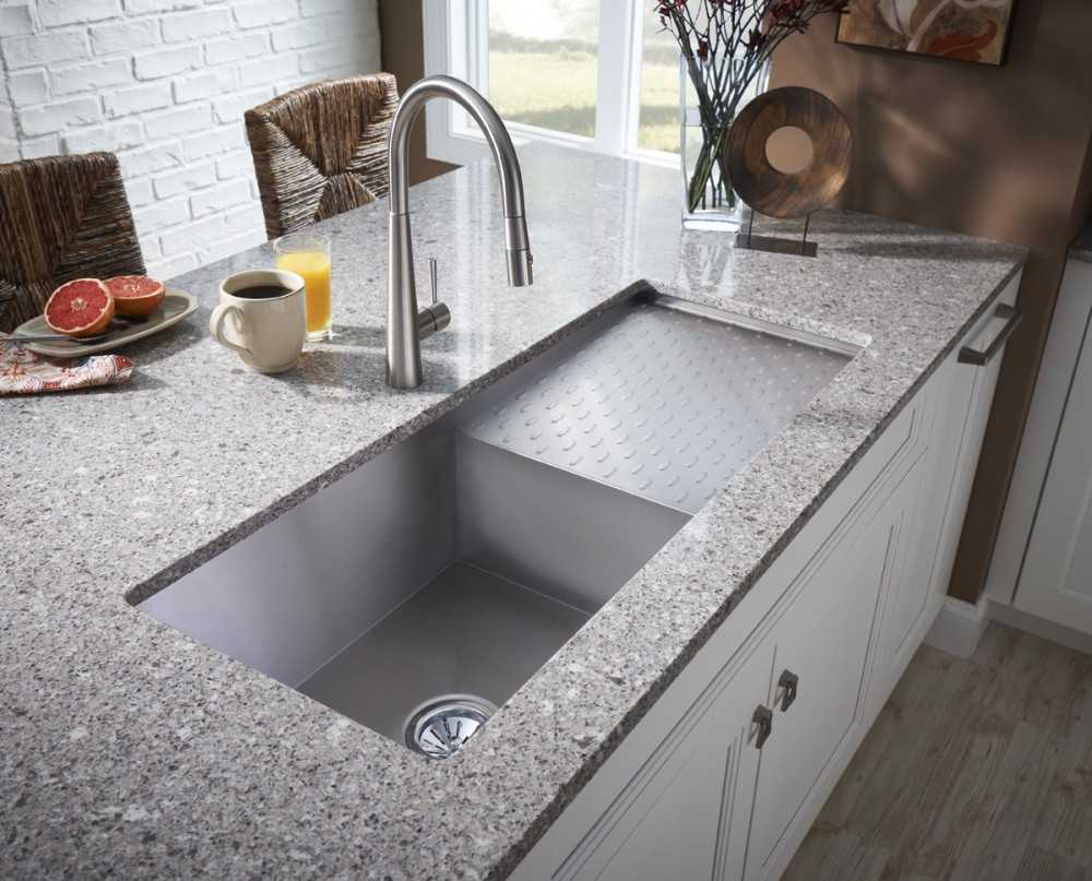 Это еще одна весьма важная часть моек, а именно особая поверхность с желобами, по которым вода будет стекать обратно в раковину. В гладких моделях вода не будет застаиваться за счет наклона в сторону мойку, и варианты, где нет крыльев или есть узкие поверхности, подойдут лишь для тех людей, которые проводят очень мало времени на своей кухне. Если вы часто и достаточного много готовите, то подобное дополнительно место около мойки будет очень выгодным, потому что сюда удобно класть посуду для просушивания после мытья, еще не промытые фрукты и овощи, или же поварешки и лопатки при готовке.
