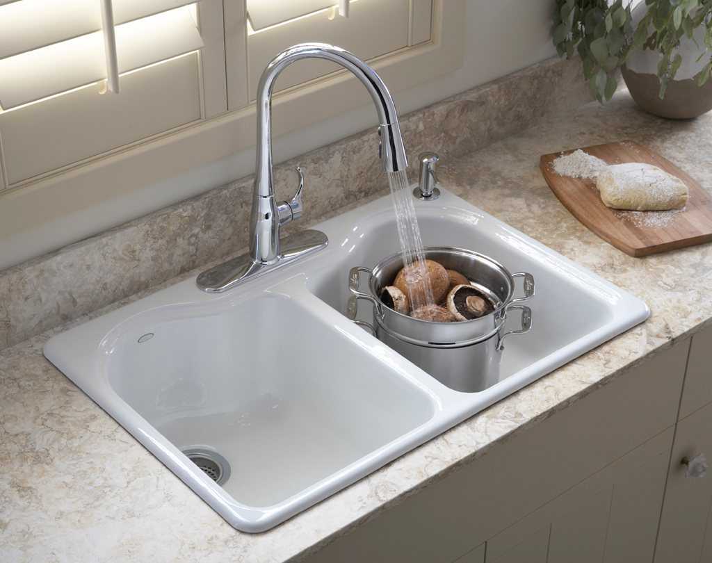 Секционные мойки. Это мультифункциональные мойки, у которых больше одной чаши. Самые распространенные — двойные или полуторные мойки. У двойных чаши одинакового размера, а у полуторных вторая сильно меньше. Мойки могут содержать больше трех чаш, но в таком случае следует позаботиться о специальном смесителе: лучше всего подойдет с выдвигающимся душем-лейкой. Даже для двойной мойки смеситель лучше выбирать прочный, чтобы выдерживал постоянные повороты крана.