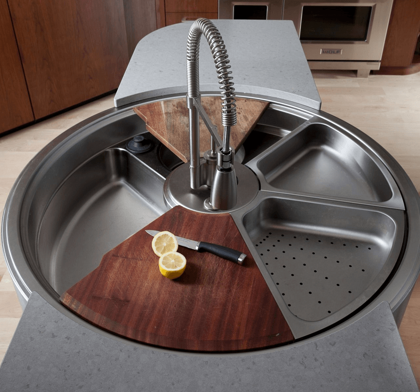 Мойка круглой формы для кухни выглядит весьма стильно, и такую раковину очень легко мыть – у нее нет углов, а еще они чуть вместительнее, чем квадратные. Недостатком является то, что не всегда есть дополнительные секции, и чаще всего это лишь большая круглая или овальная чаша, которая просто была встроена в поверхность столешницы.