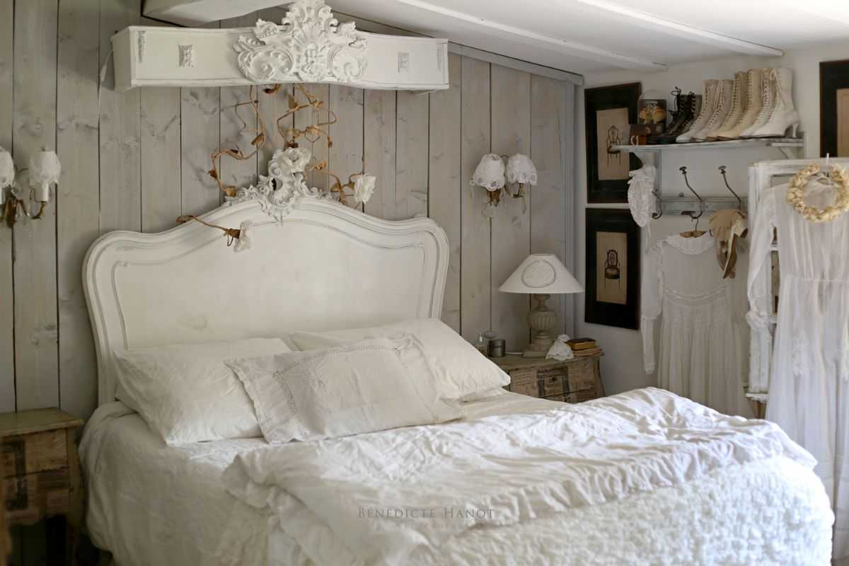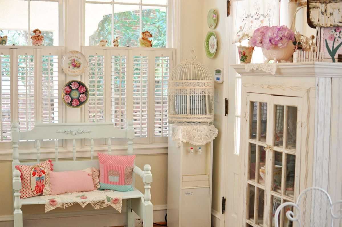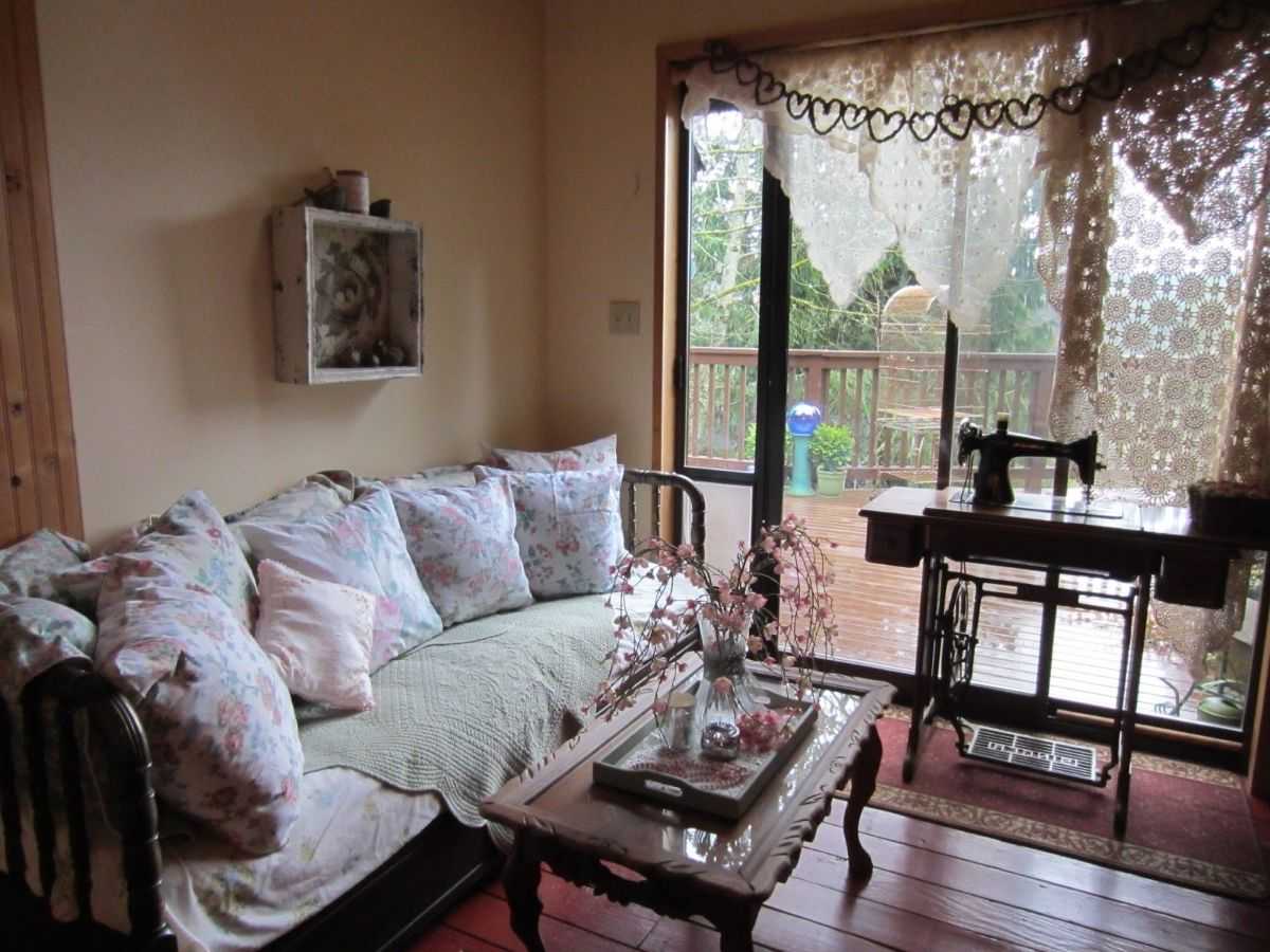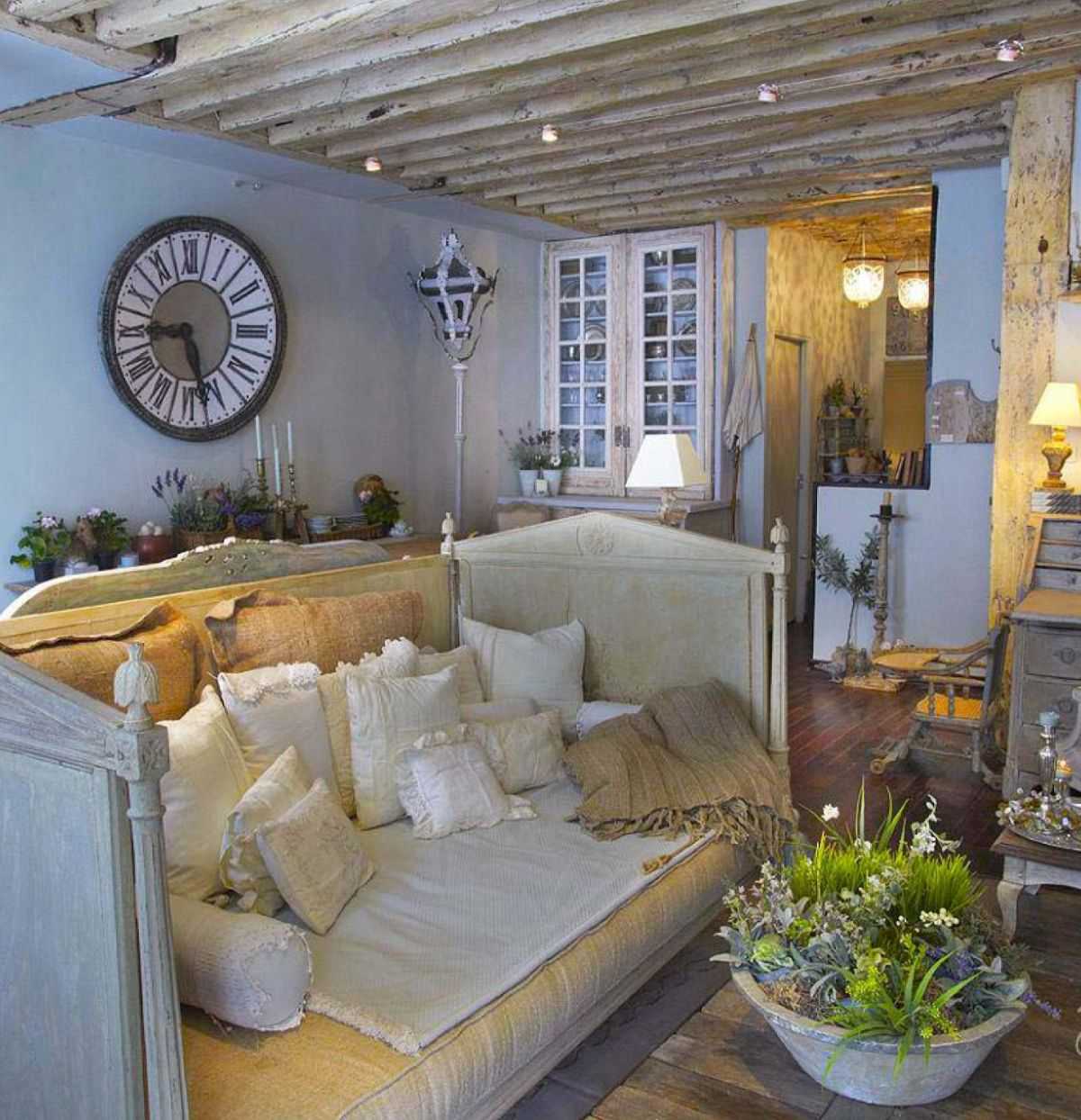 Во всем должна быть гармония: кованая кровать, покрытая кружевным покрывалом, дополнит деревянный комод с потрескавшимся фасадом; расстелить на полу круглый «бабушкин» вязаный плед. В гостиной можно поставить круглый стол с белой скатертью, на нем — простую вазу с цветами. Часы с кукушкой на стене и черно-белые фотографии на полке завершают стиль.