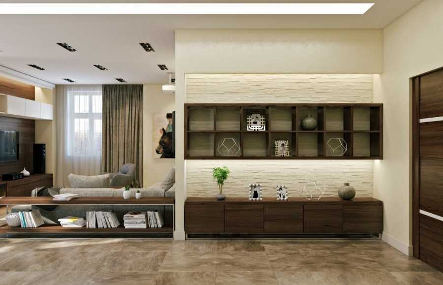 Зонировать комнату можно и тканевыми занавесками. Если вы хотите использовать гипсокартонные конструкции, сделайте их ажурными, встройте в них освещение, полки оставьте открытыми
