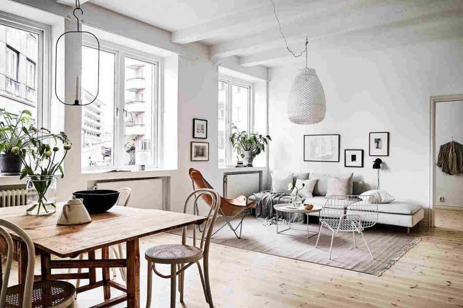 Скандинавское направление не менее востребовано: оно базируется на сочетании холодного белого цвета с теплым деревом. Дополните картину живыми растениями и уютным декором.