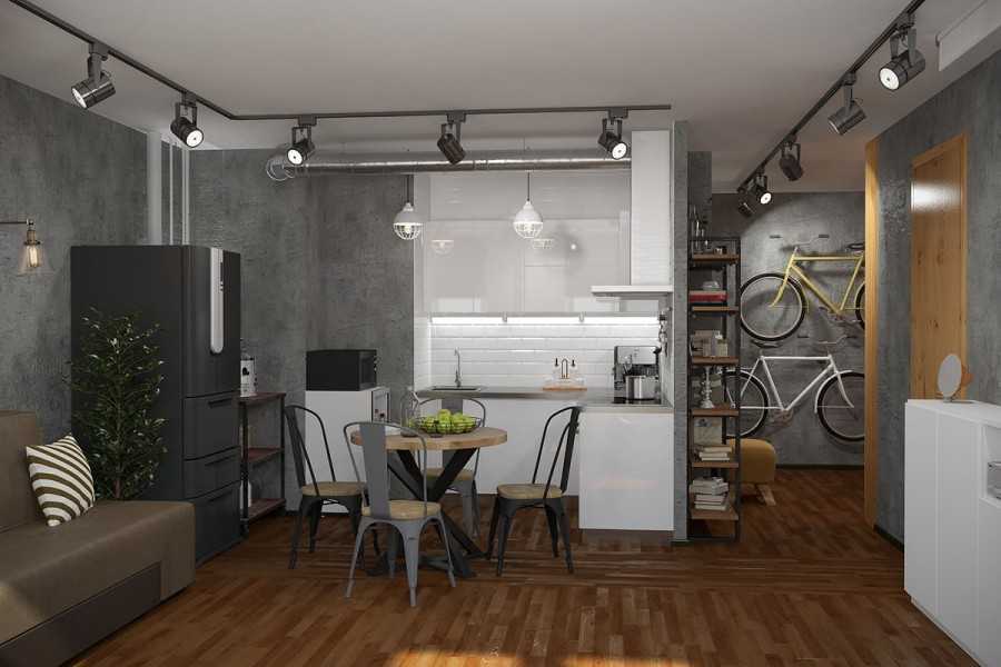 Снесите перегородки между кухней и комнатой, функционально расширив оба помещения. Создайте обеденную зону за счет вытянутых узких столов (они же отгородят зону для приготовления еды от основной части квартиры). Так вы сделаете помещение более просторным и светлым.
