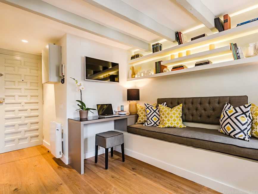 С его помощью можно не только зонировать площадь квартиры 40 кв м, но и получить функциональный объект. Если подиум достаточно широкий, можно спрятать кровать на колесиках. Если возвышение небольшое, то внизу оборудуют ящики для хранения всевозможных предметов или полки. В первом случае можно разместить вторую кровать поверх подиума. Во втором: оборудовать рабочее место компьютерным столом.