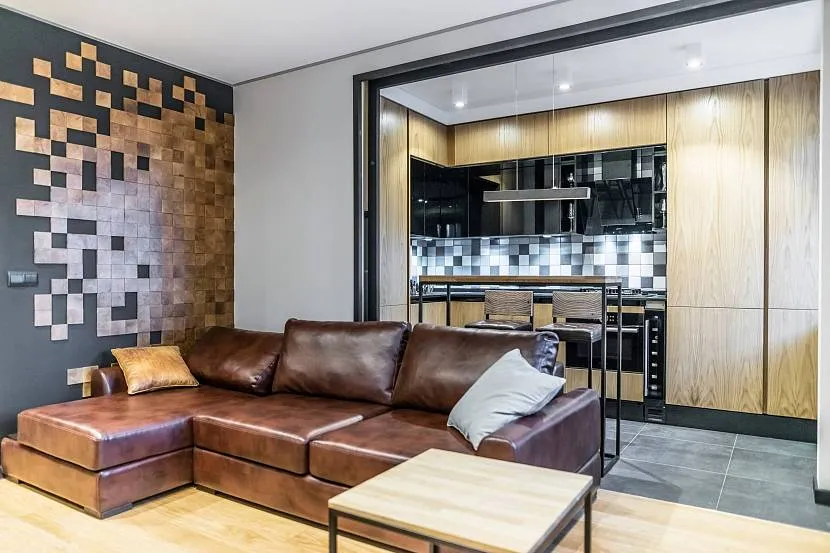 Для отделки выбрали практичные материалы, но и учитывали их эстетику. Рабочая зона кухни выложена керамогранитом с необычным рисунком, причем его «завели» и на стены, чтобы усилить практичность и долговечность ремонта. В пространстве «второй гостиной» инженерная доска. Стены окрашены и дополнены молдингами, одна из стен 3D-панели под дерево.