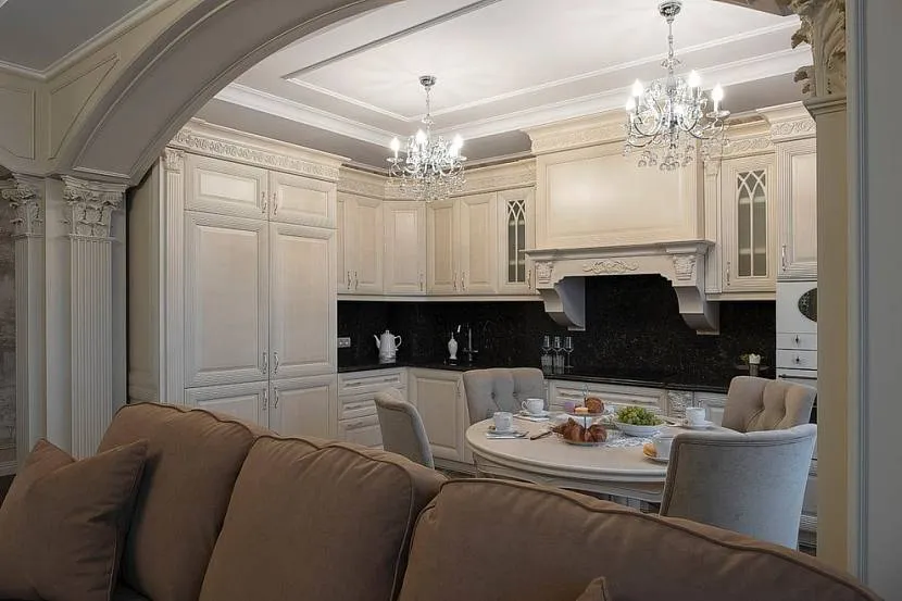 Если за одной дверью расположена негазифицированная кухня, а за другой — прихожая, от полотен откажитесь вообще, оставив только коробки. Сэкономите площадь комнат, создав эффект большого открытого пространства даже в маленькой проходной гостиной.