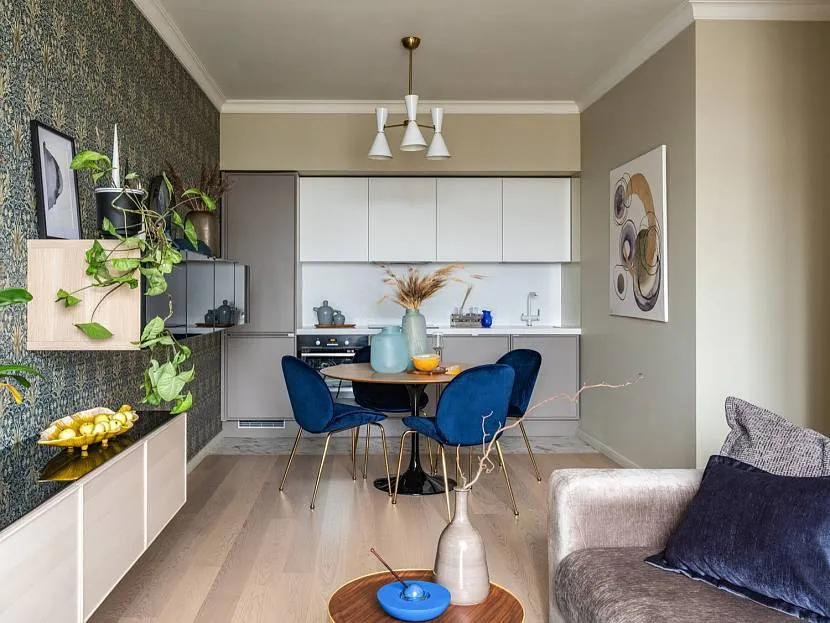 Простое объединение кухни и гостиной отлично подойдёт для жизни двух человек в двухкомнатной квартире. Плюсом будет и организация встроенного гардероба.