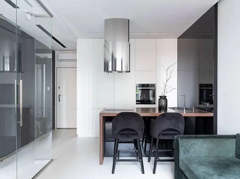 Кухню визуально и функционально разделили на две части. Первая высокие шкафы до потолка с местом для хранения и встроенной техникой, а также витриной для посуды. Вторая остров с барной стойкой, на острове расположена варочная панель и мойка, внутри есть ящики для хранения. Барная стойка выше, чем рабочая поверхность острова, что не только удобно, но и эстетично, из зоны отдыха не видно возможной грязной посуды.