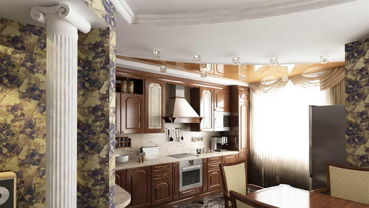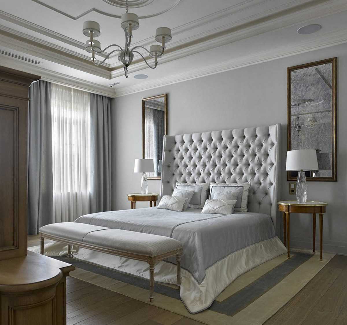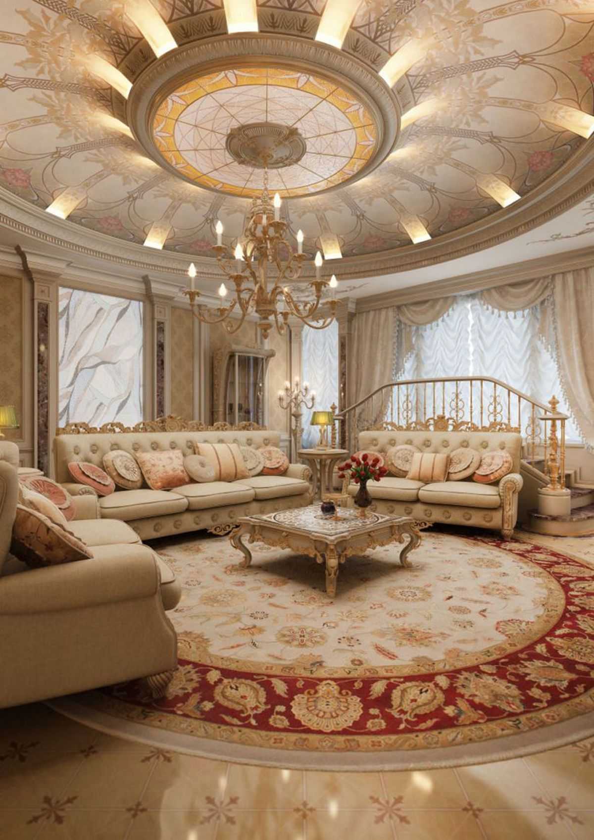 При оформлении пространства над головой подчеркивают роскошь дизайна. В интерьере уместны как классические ровные конструкции, так и сложные виды (сферы, своды). Высокие потолки украшают росписью, витиеватой лепниной. Декоративные элементы переходят на стену, создавая единую композицию.