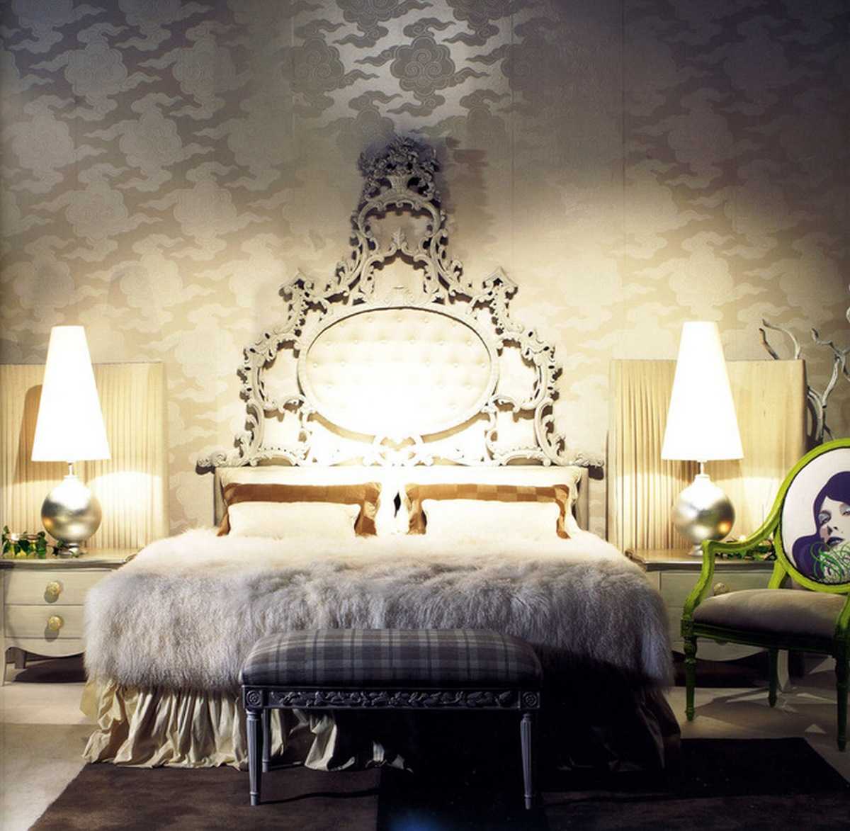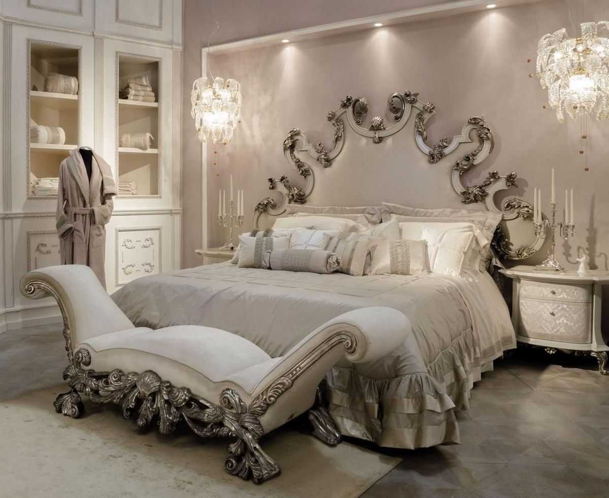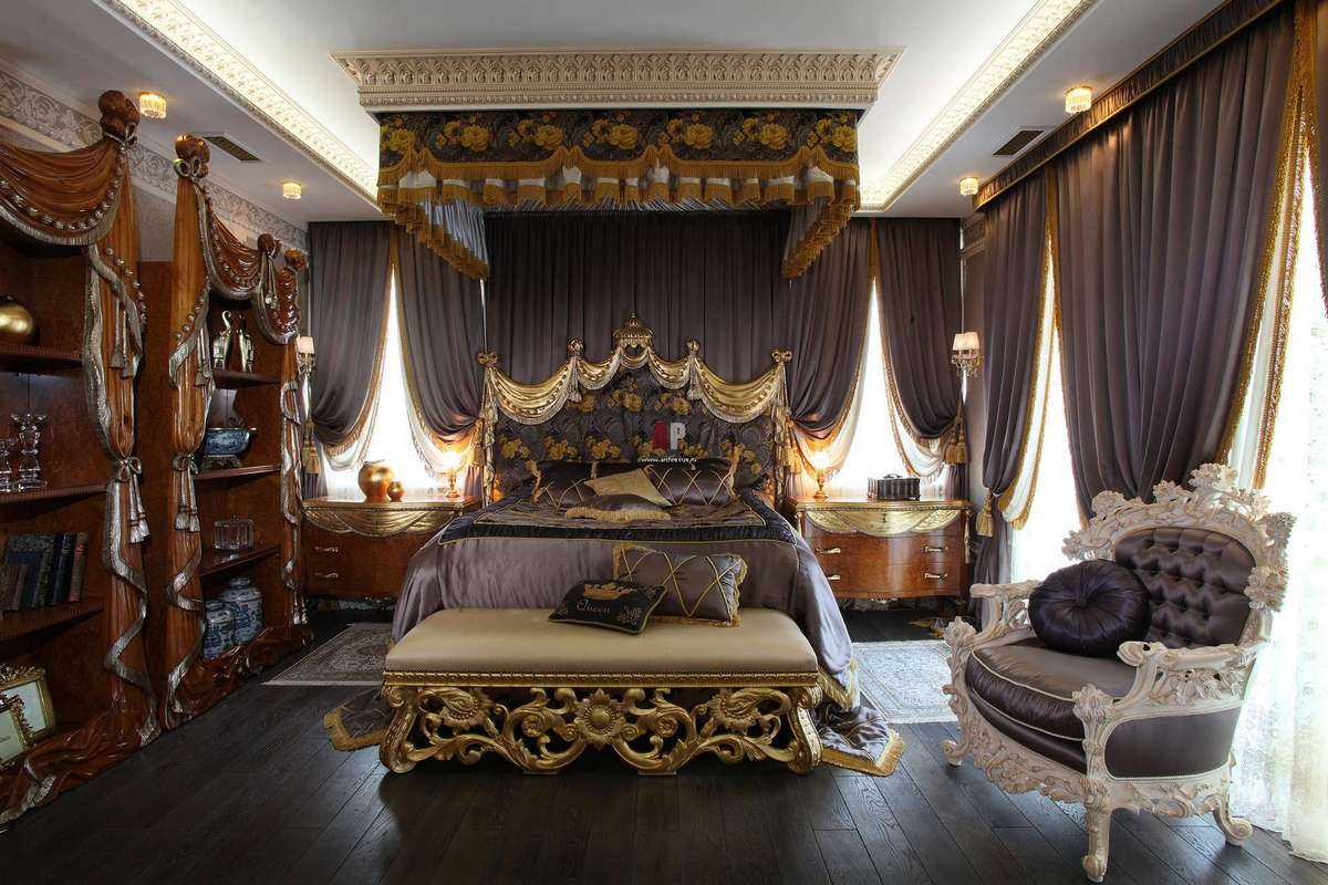 Стиль барокко в интерьере спальни предполагает использование дорогостоящих, шикарных материалов: