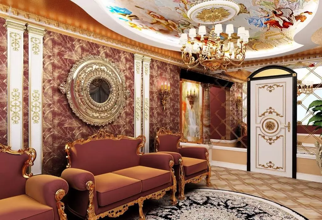 Барокко в интерьере похож на рококо, ответвление классического стиля начала 18 века, который делает акцент на орнаменте, мифологической тематике, и обилии декоративных элементов. Для интерьера барокко характерна контрастность цветов, ювелирные и грациозные золотые вставки, отделка.