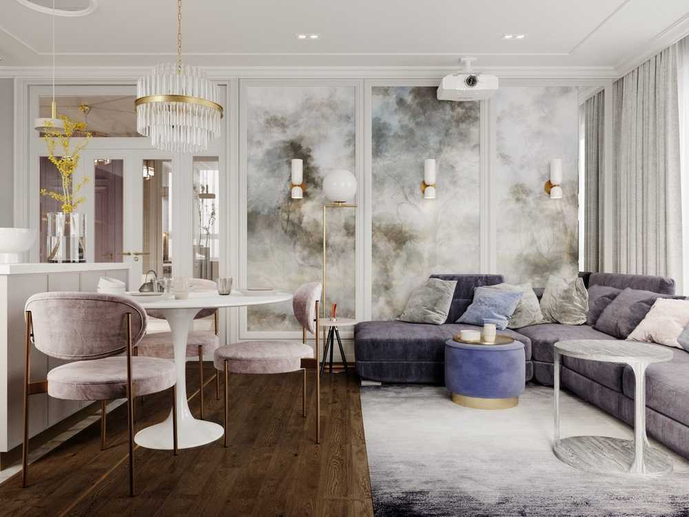 Дизайн гостиной очень пёстрый и контрастный. Стены отделаны классическими молдингами, которые очерчивают участки роскошной декоративной росписи. В интерьере множество ярких элементов: позолоченные светильники, фиолетовый диван, хрустальная люстра.