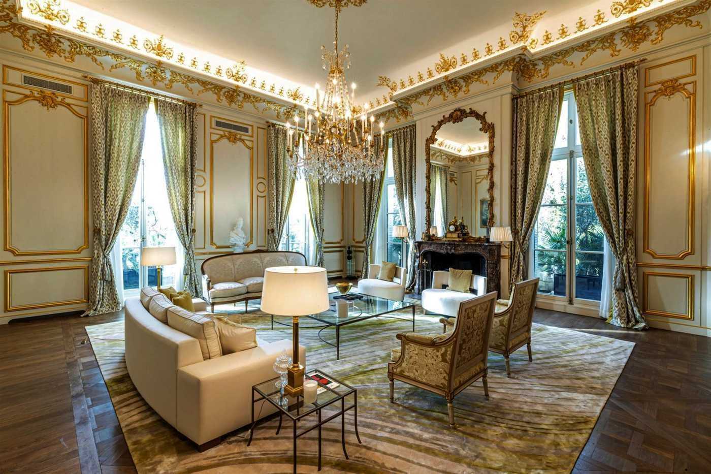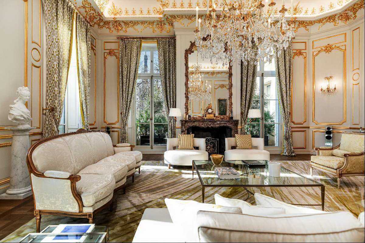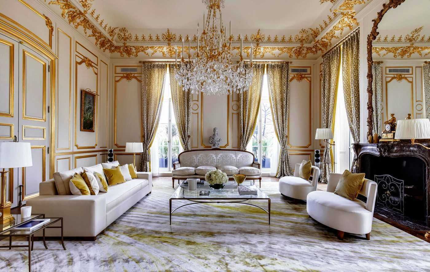 Стены комнаты отделаны белыми стеновыми панелями буазери и обильно покрыты позолоченным декором. В гостиной присутствует классический для дворцового интерьера камин из натурального мрамора. Пол уложен дорогим художественным паркетом. По периметру комнаты классические французские распашные двери позволяют выйти на балкон, откуда открывается шикарный вид на центр города и Эйфелеву башню.