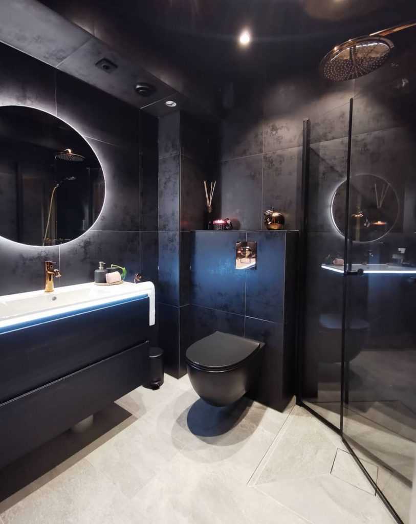 Самые смелые оформляют ванную полностью в темной палитре, включая черный или графитовый оттенки. На их фоне эффектно блестят медная фурнитура, белая сантехника и хрустальная люстра. Темный интерьер выглядит драматично и современно, но подходит больше для просторных комнат.