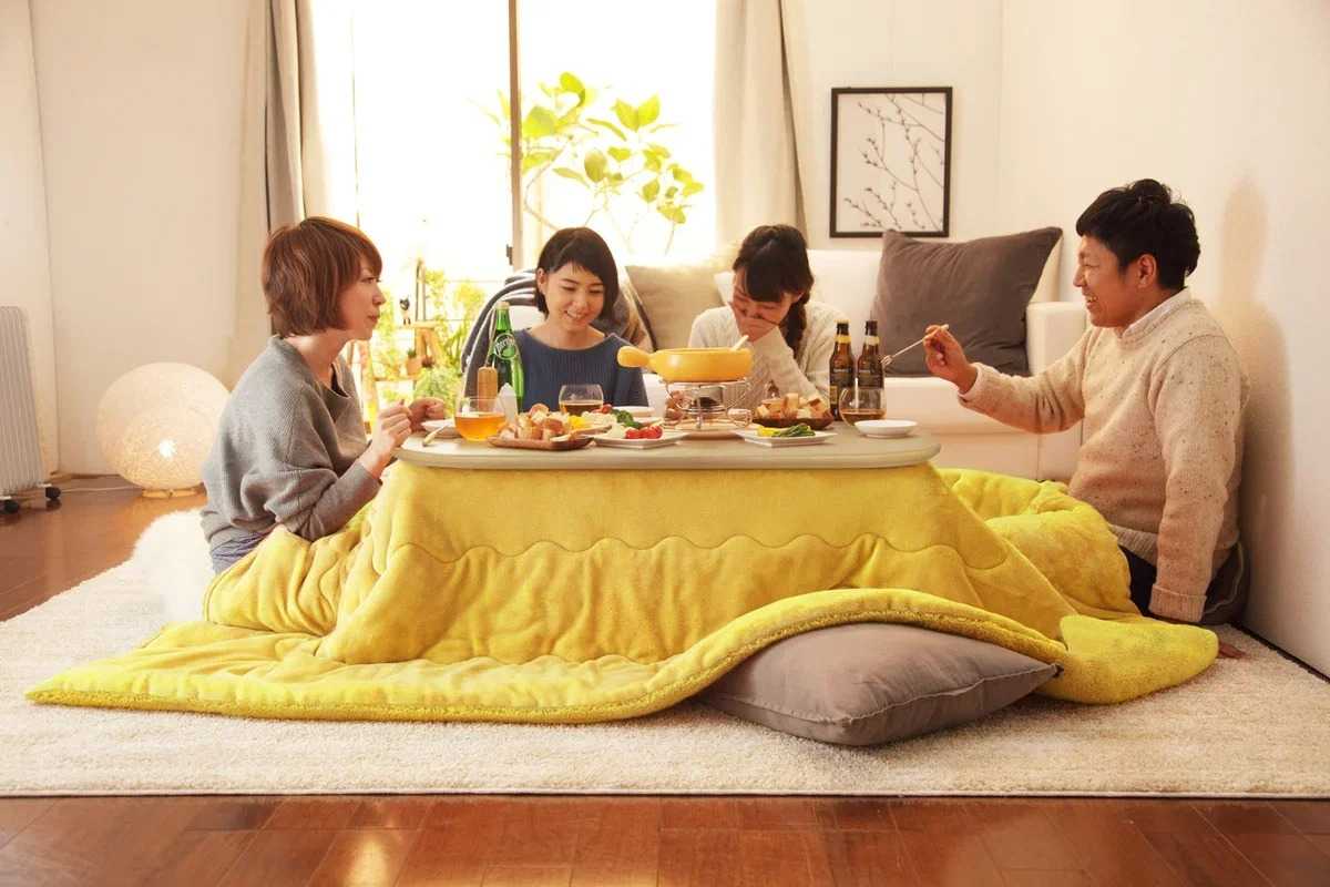 Среди населения страны популярен необычный метод получения тепла – котацу. Представляет он собой вид электрического обогревателя в одеяле, встроенном в столешницу. Японцы могут сидеть или лежать под одеялом, а перед ними будет удобный стол. Существует несколько вариантов приспособления: столы для работы с компьютером, чайные столики, столешницы для отдыха на диване и игр в настольные игры.