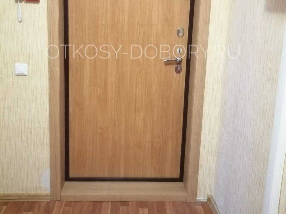 На первом этапе нужно сделать замеры в двух плоскостях. Померить ширину порога и высоту. Высоту берём с учётом того, что в дальнейшем вы будете облицовывать каркас тем же материалом, который вы используете для обрамления проёма входной двери.