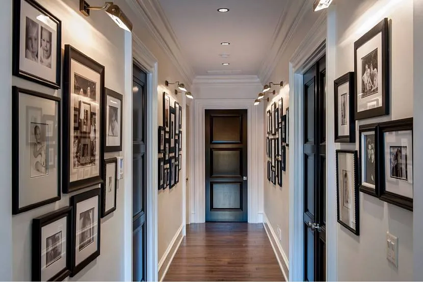 Рисунки в рамах смотрятся гармонично, если их размер пропорционален размеру стены. В общем случае экспозиция не должна занимать более трети свободной площади. В тесном коридоре лучше ограничиться одной-тремя рамками, которые располагают на уровне глаз.