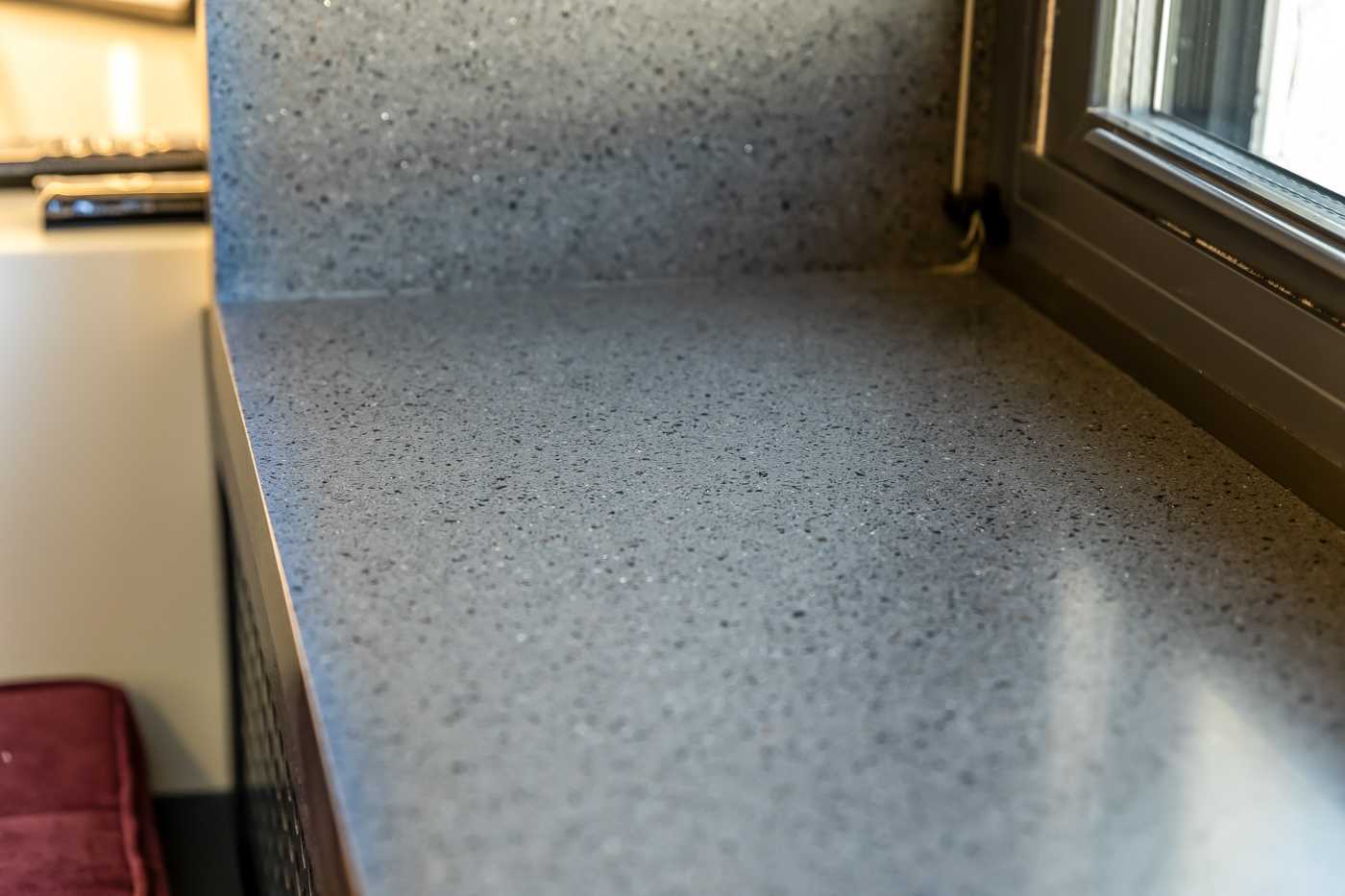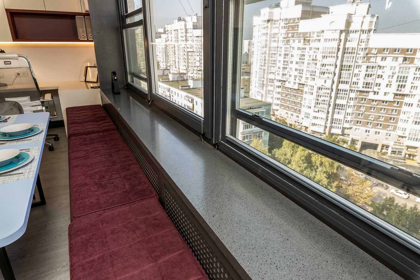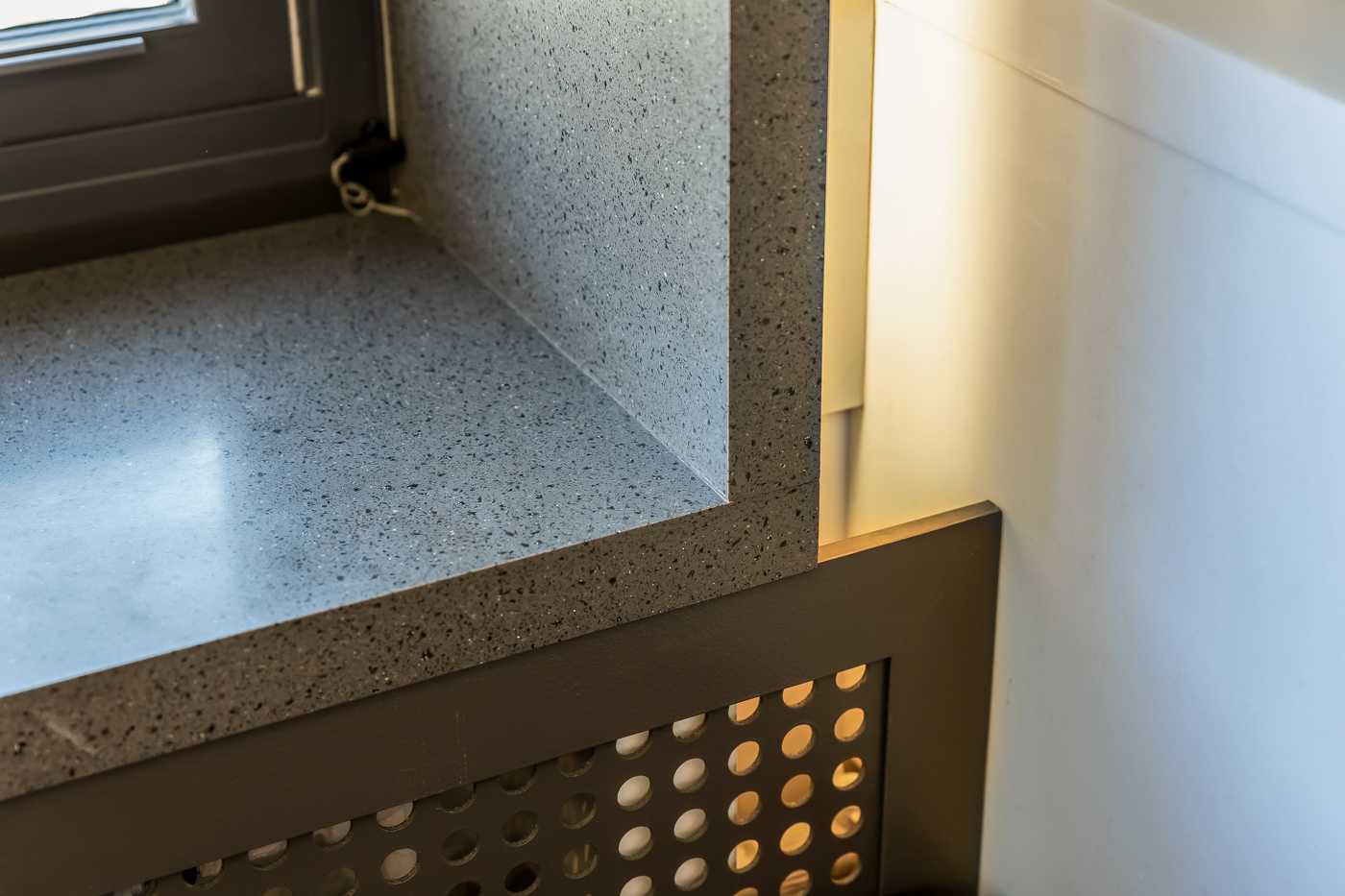 Для подоконника и откосов Екатерина выбрала искусственный камень HI-MACS в цвете Grey Onix, благородный серый с вкраплениями темных и светлых кристаллов. Благодаря данному графитовому обрамлению из камня, окно более эффектно выделяется на светлом фоне стен и потолка из-за увеличенного размера подоконника и оконного проема. По задумке автора проекта именно окно должно выйти на первый план обновленного интерьера, что подчеркивает парадная отделка из легкого в уходе и практичного искусственного камня HI-MACS.