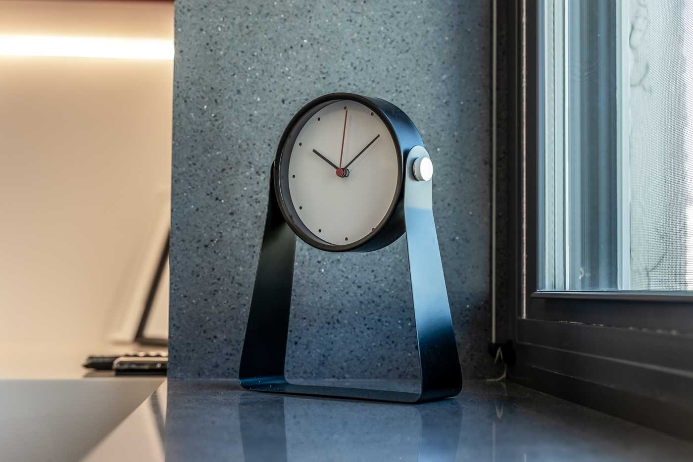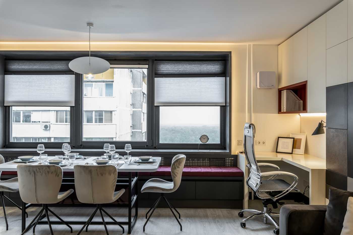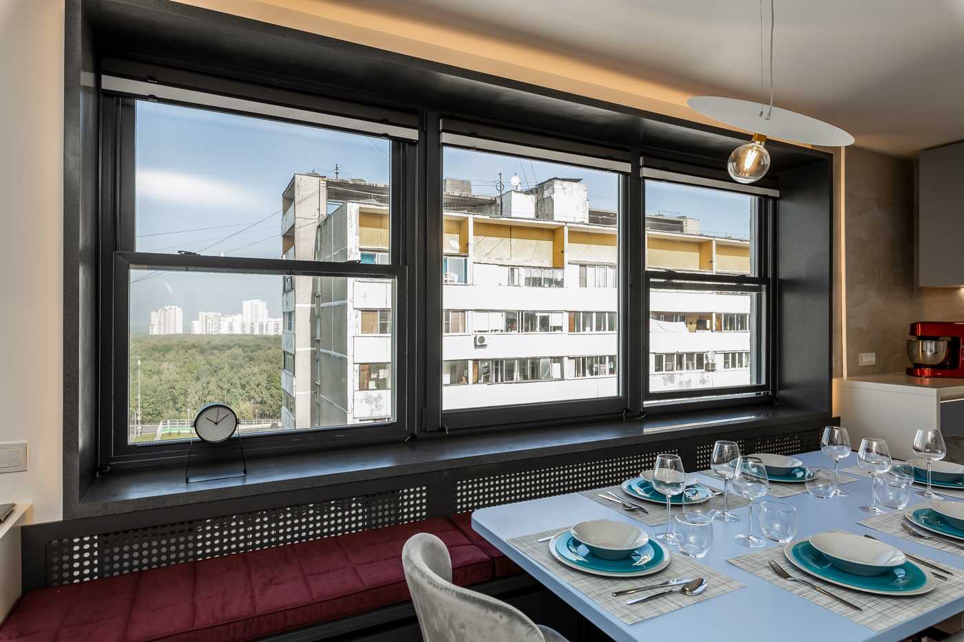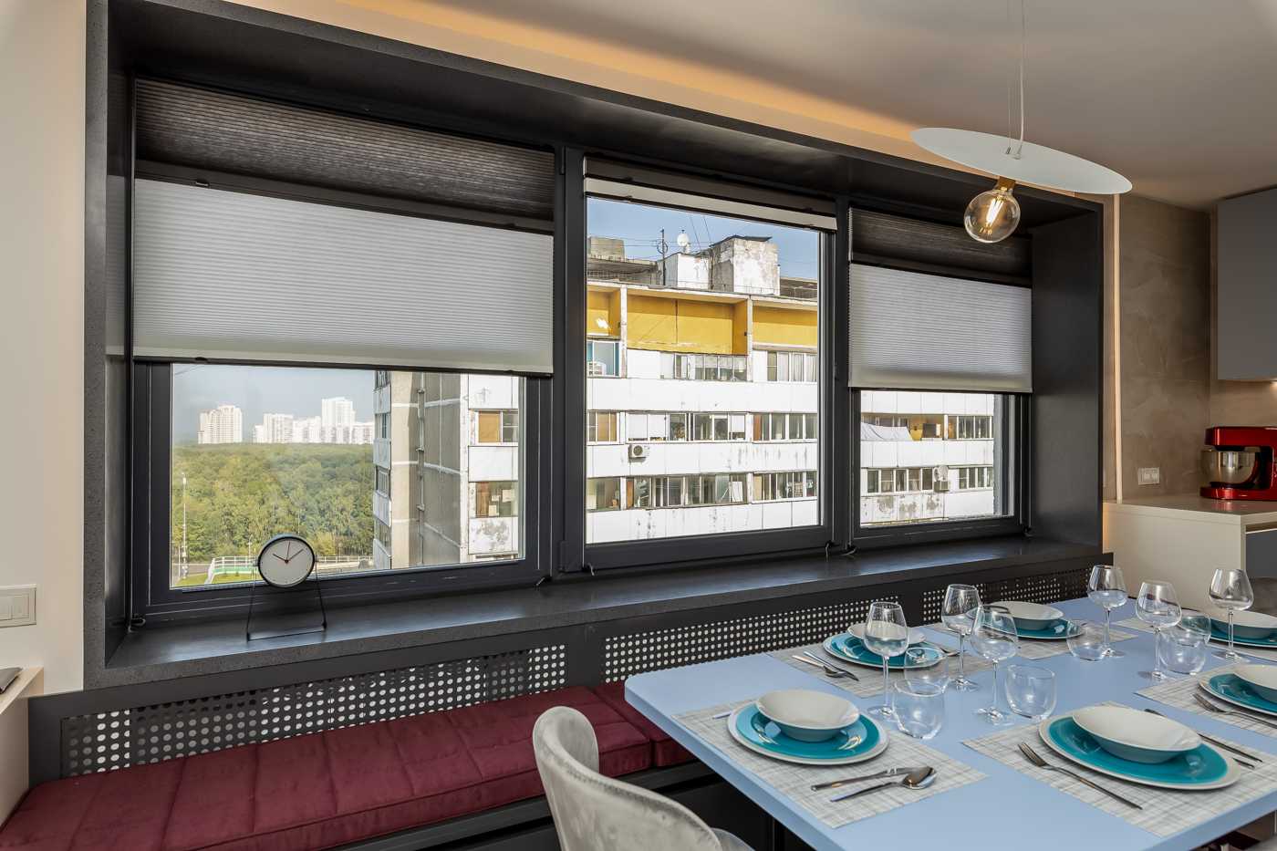 Для подоконника и откосов Екатерина выбрала искусственный камень HI-MACS в цвете Grey Onix, благородный серый с вкраплениями темных и светлых кристаллов. Благодаря данному графитовому обрамлению из камня, окно более эффектно выделяется на светлом фоне стен и потолка из-за увеличенного размера подоконника и оконного проема. По задумке автора проекта именно окно должно выйти на первый план обновленного интерьера, что подчеркивает парадная отделка из легкого в уходе и практичного искусственного камня HI-MACS.