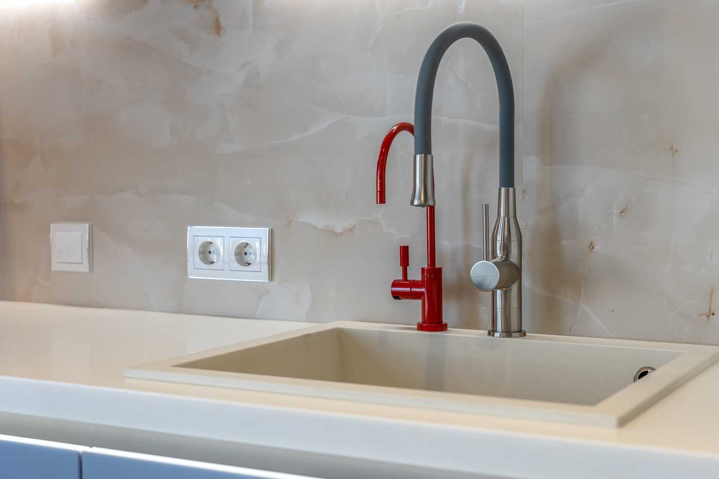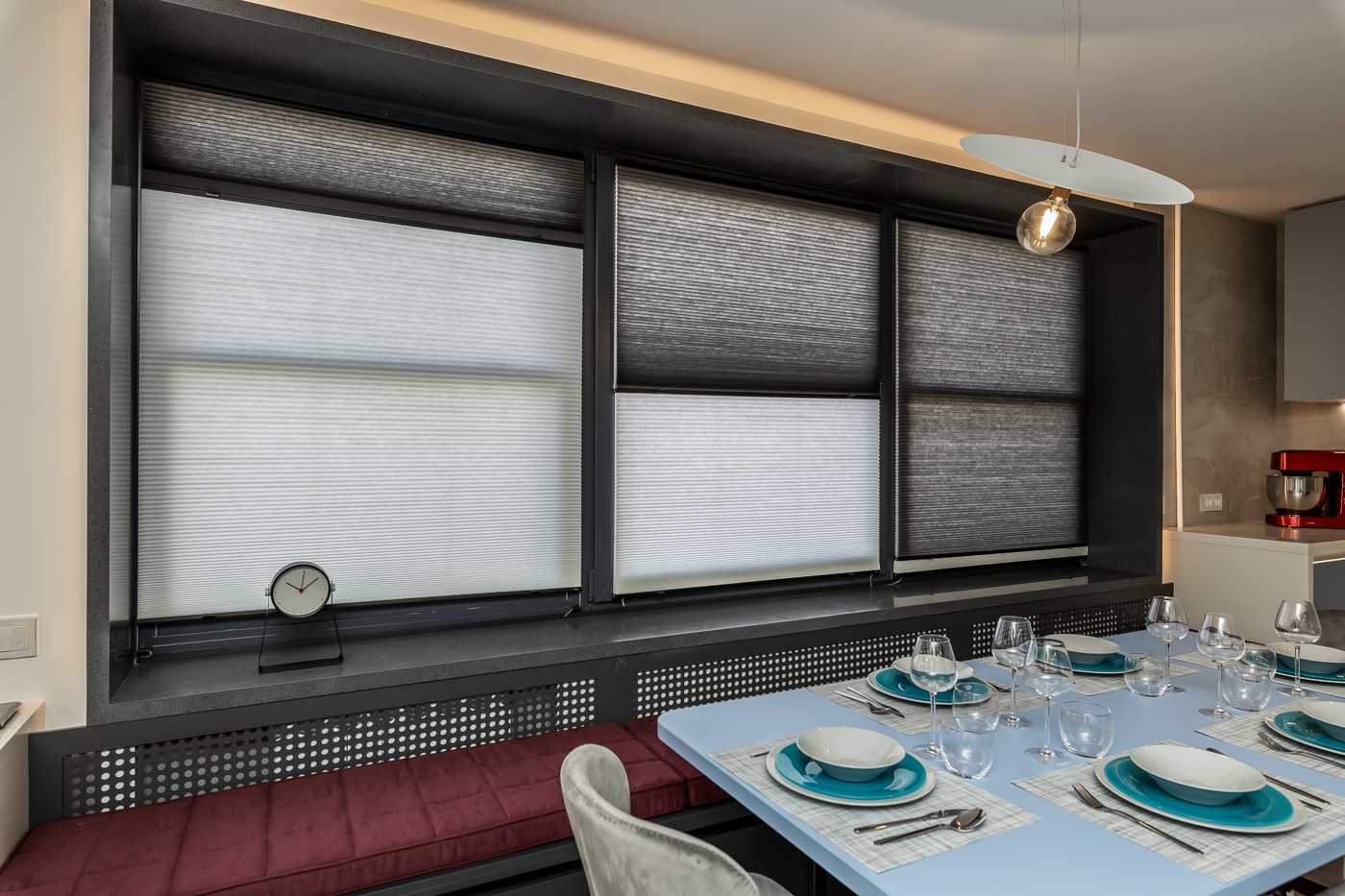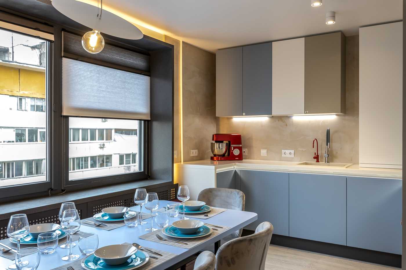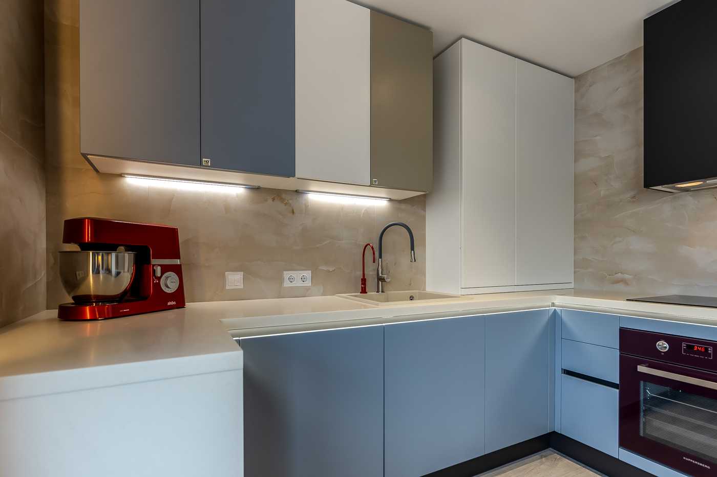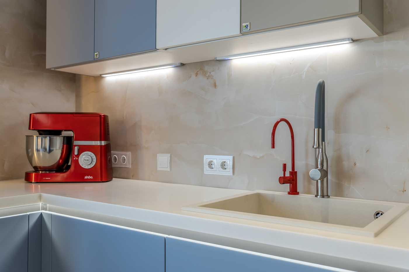 За счёт перекомпоновки бытовых приборов, дизайнеру удалось увеличить площадь рабочих поверхностей. Столешница нежного кремового оттенка напоминает рисовую бумагу. Как и на подоконнике, это искусственный камень HI-MACS, который не впитывает загрязнения, так что ни свекла, ни кофе, ни вино ему нипочем.