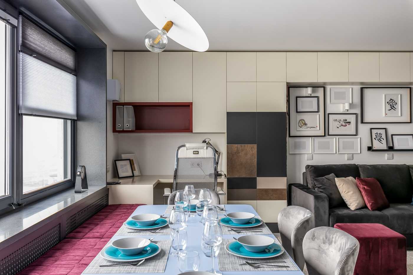 Для новой переделки кухни-гостиной дизайнером Екатериной Кудряшовой был выбран стиль японской художницы Токо Шиноды, в картинах которой сочетаются строгость и легкий творческих хаос – как и в характере героев программы «Квартирный вопрос». Дизайнеру хотелось создать на каждой стене и чистый лист для творчества и элементы для вдохновения. За счет строгости, лаконичности, простых форм и нескольких хаотичных линий создана неповторимая композиция.