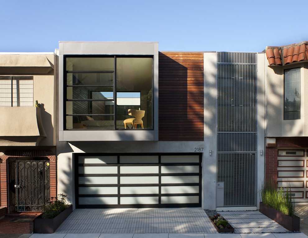 На следующем фото мы видим, как металлическая решетка используется в конструкции двери и для создания оригинального фасада двухэтажного частного дома.