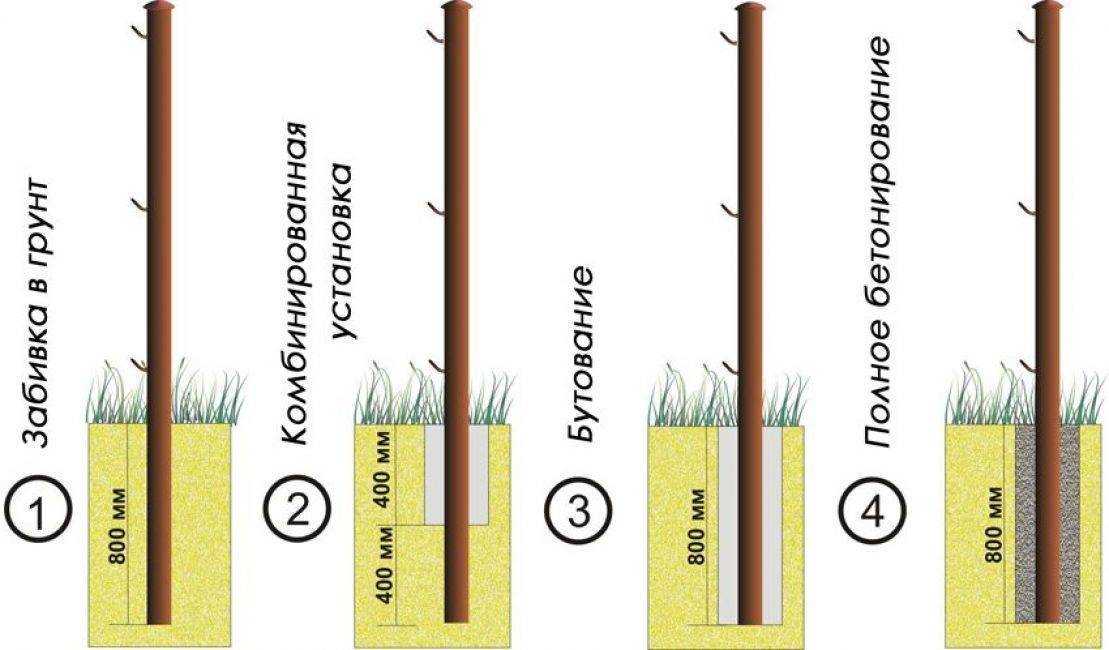 Свободное пространство между опорой и стенками приямка заполняют щебнем и мелким камнем, перемежая слоями грунта, и хорошо трамбуют каждый слой. Если возводится секционный забор, вес которого заметно выше натяжного из-за сварных рам, опоры дополнительно бетонируют на 40 см высоты приямка либо полностью заливают бетоном вместо забутовки.