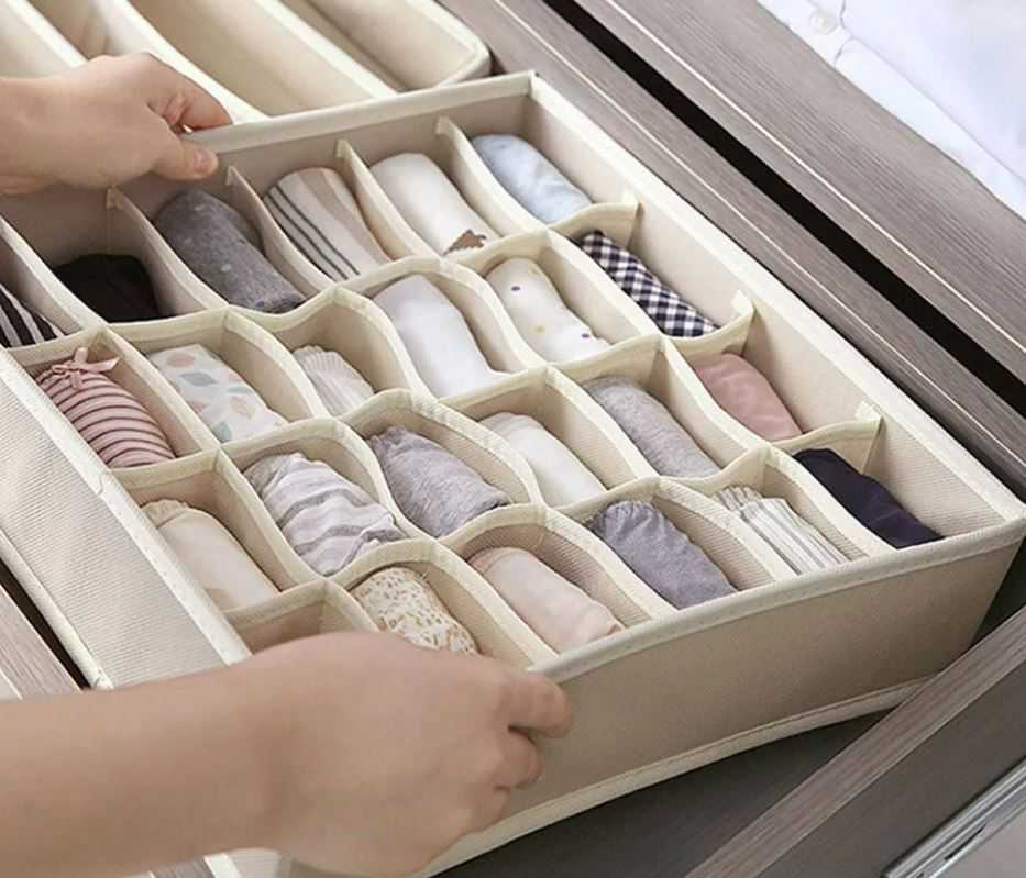 Размещение нижнего белья. Нижнее белье рекомендуется размещать в выдвижных ящиках или на полках в специальных органайзерах. Такой контейнер разделен внутри на несколько секций под каждый комплект. Нижнее белье используется регулярно, поэтому складывайте его в то место, к которому имеется быстрый доступ.