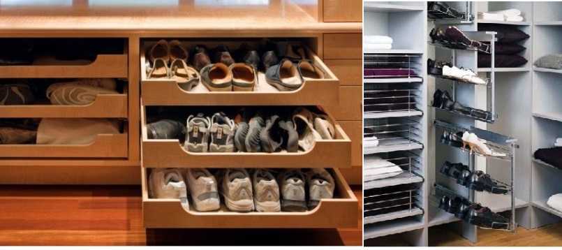 Обувь. Хранят в нижней зоне на полках или специальных металлических поставках. Сезонную обувь лучше разместить в контейнеры и убрать или на нижний, или на верхний ярус. Другой вариант — закрытая обувница — система откидных полок. Недостатком является то, что в нее не влезут высокие сапоги.