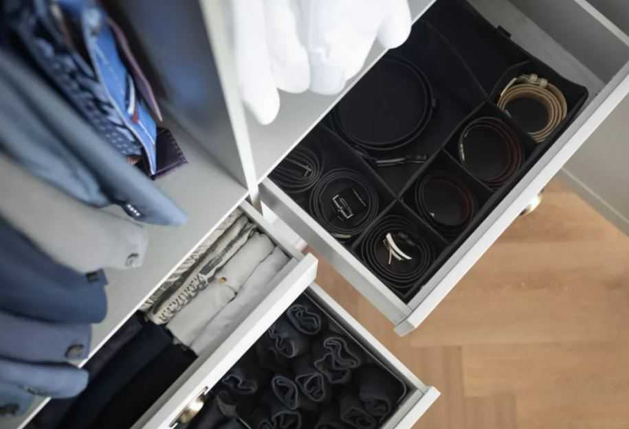 Штаны и ремни. Для ремней подойдет ящик с разделениями под каждый аксессуар. Выдвижные брючницы держат брюки в вертикальном положении, при этом занимая совсем мало места. Так вещи не мнутся, у «стрелок» не образуется залом.