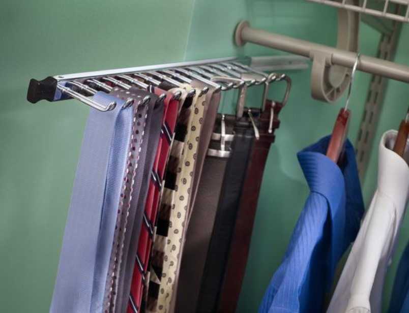 Стоит подумать об отделе, в котором будут храниться пояса и галстуки. Он должен выглядеть как уменьшенная версия брючницы. Устанавливаются обычно сбоку, в секции для одежды. Еще галстуки можно хранить в выдвижных ящиках, разбитых на квадраты перегородками.