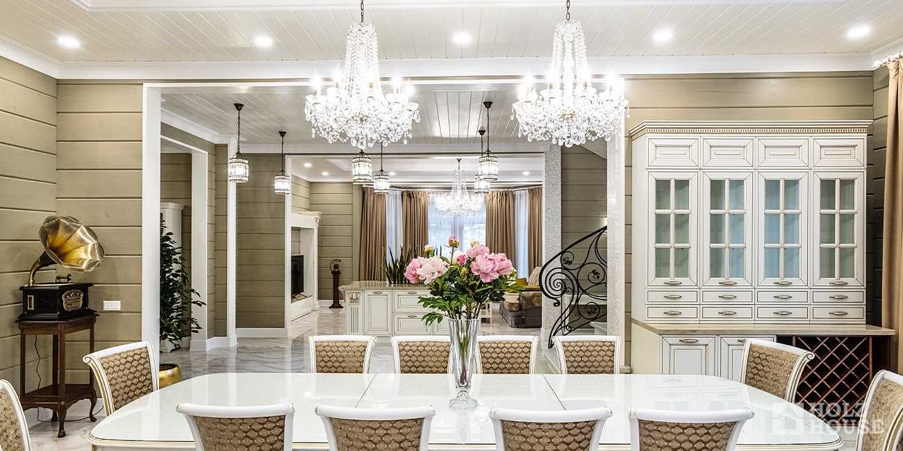Классическую архитектуру определяют строгость и четкость линий, геометричность форм, сдержанность в оформлении экстерьера. Классический стиль сохраняет актуальность во все времена, за что его часто выбирают владельцы загородных коттеджей. Традиционная классика – это всегда изысканный вкус, солидность и респектабельность. Стиль часто выбирают для проектирования больших по площади домов, поскольку классика отлично подчеркивает масштабы и основательность здания. Здание проектируется и оформляется по принципу симметрии, в планировке и дизайне экстерьера могут использоваться колонны, лепные карнизы, портики и эркеры. Декор в оформлении обязательно присутствует, но его не должно быть слишком много. Материалы в строительстве дома, отделке и дизайне интерьера выбирают в основном натуральные и дорогие: древесина высокого качества, мрамор, природный камень, натуральная черепица. Интерьеры домов в стиле благородной классики изящно сочетают в дизайне строгую симметрию и богатую роскошь в оформлении.