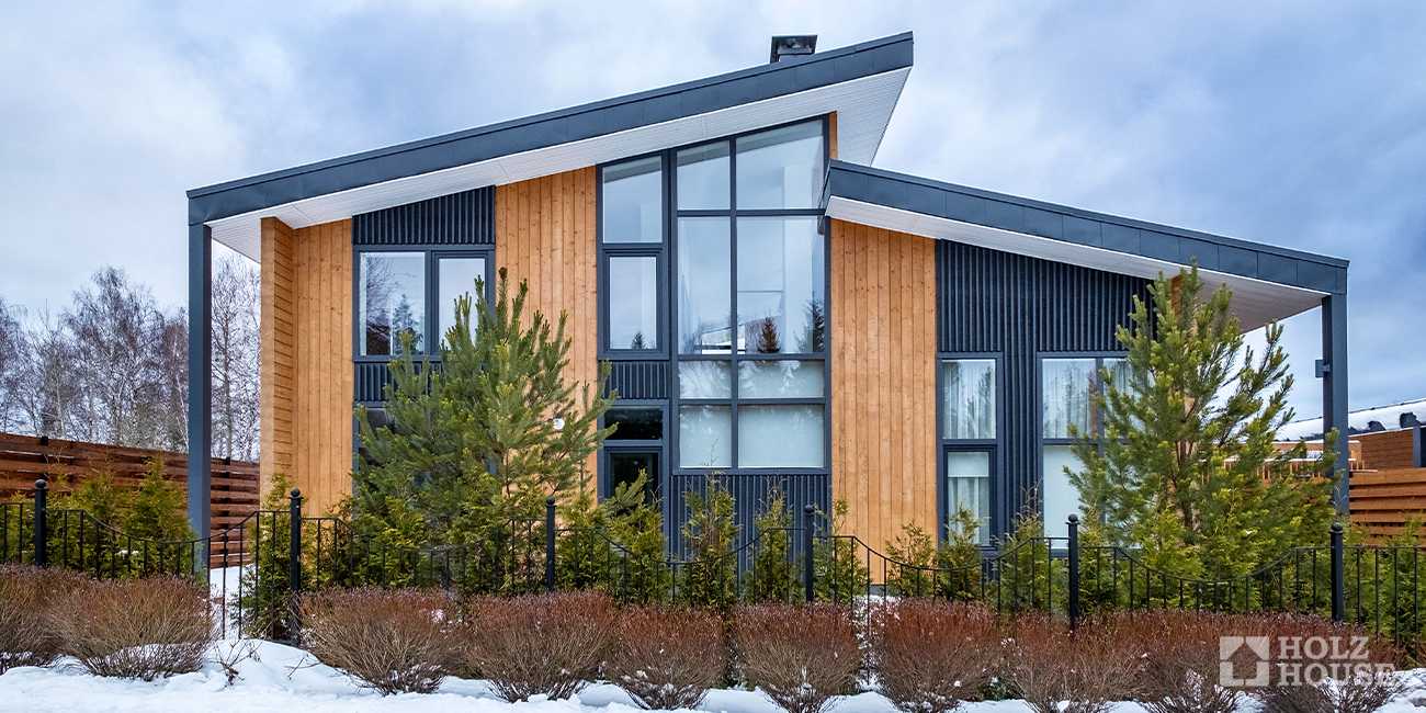 Основные черты домов в стиле минимализма: большие оконные проемы, горизонтальная крыша, сочетание вертикальных и горизонтальных прямых. Базовые цвета таких архитектурных объектов — светлые, нейтральные. Геометричность архитектурного решения подчеркивается черным цветом. Жилища в минималистическом стиле возводятся в один-два этажа. Применяемые при строительстве материалы: бетон и стекло, для отделки используется натуральная деревянная доска и клинкерная плитка.