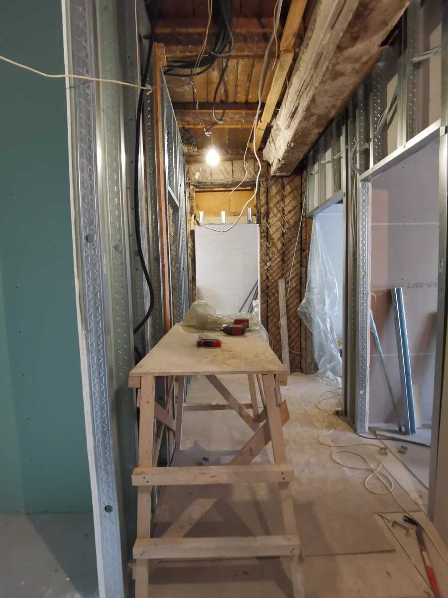 Балка выполняла несущую нагрузку и подпирала верхнее перекрытие. Конечно, изначально в проекте я никак не могла ее предусмотреть, поэтому всю планировку пришлось немного поменять прямо по ходу ремонта. Кроме того, выяснилось, что часть стен необходимо заменить — они испортились от времени и прогнили от постоянных протечек