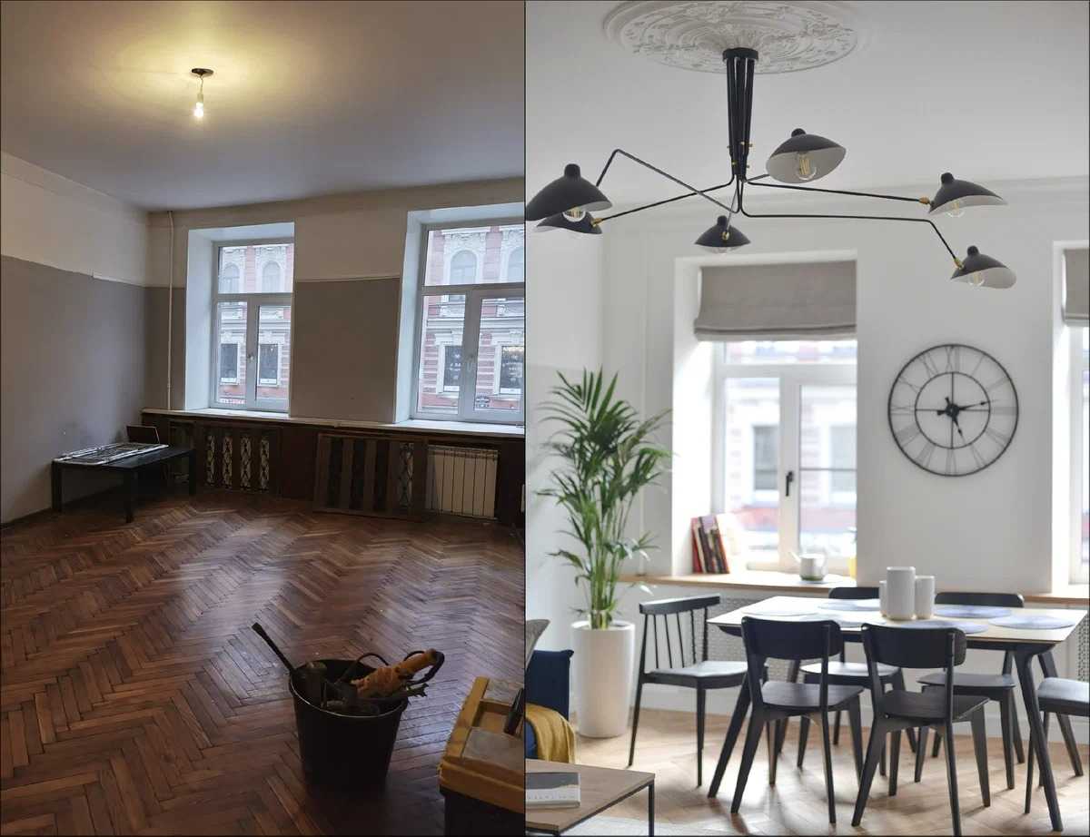 Тут, конечно, зависит от стиля, которые выбрали заказчики, и их пожеланий, но я бы рекомендовал стараться сохранить оригинальный антураж по максимуму: декоративные дверные ручки, паркет, двери, люстры. По возможности, нужно сохранить 100% лепного декора: карнизы, молдинги, розетки на потолке.