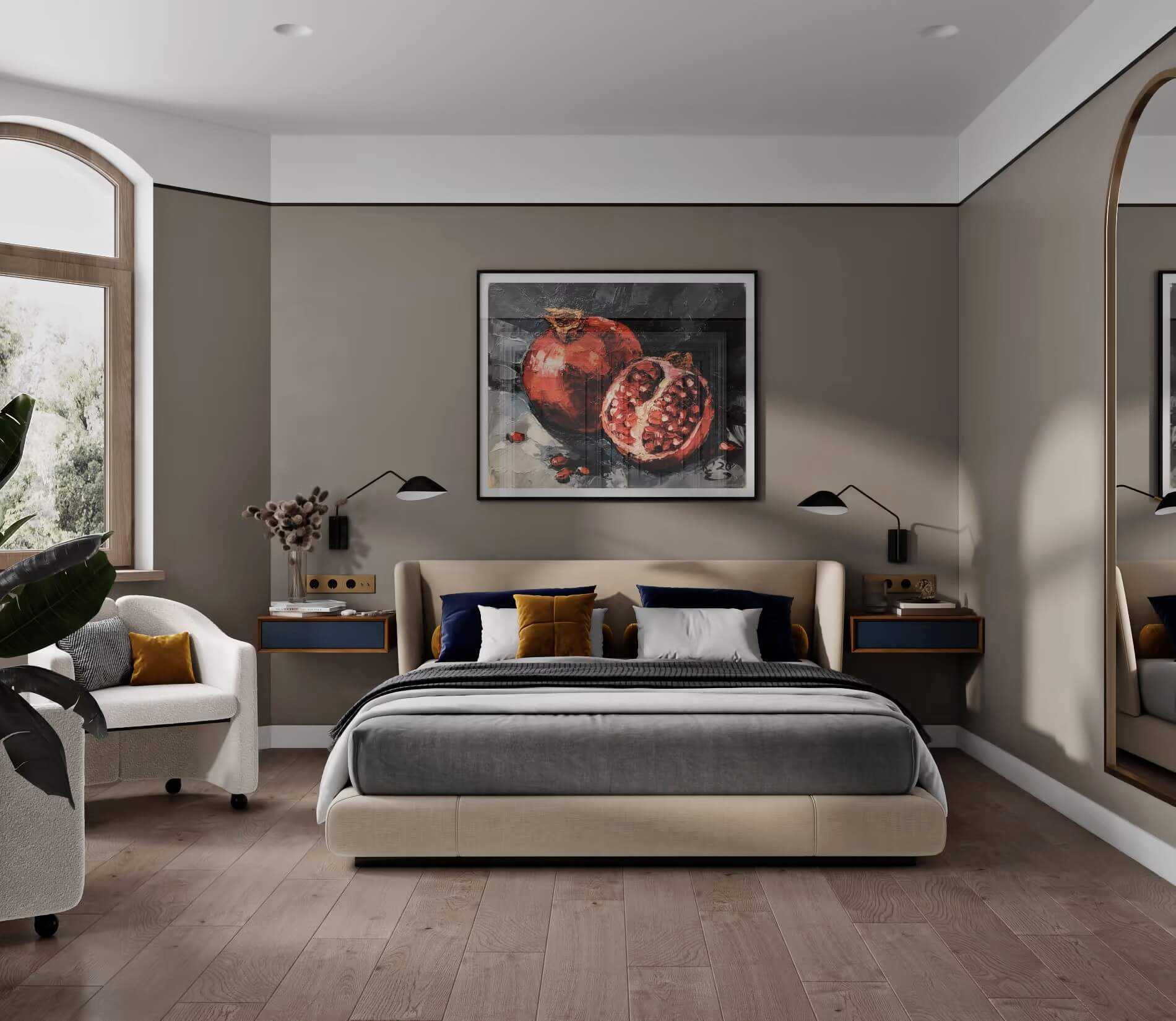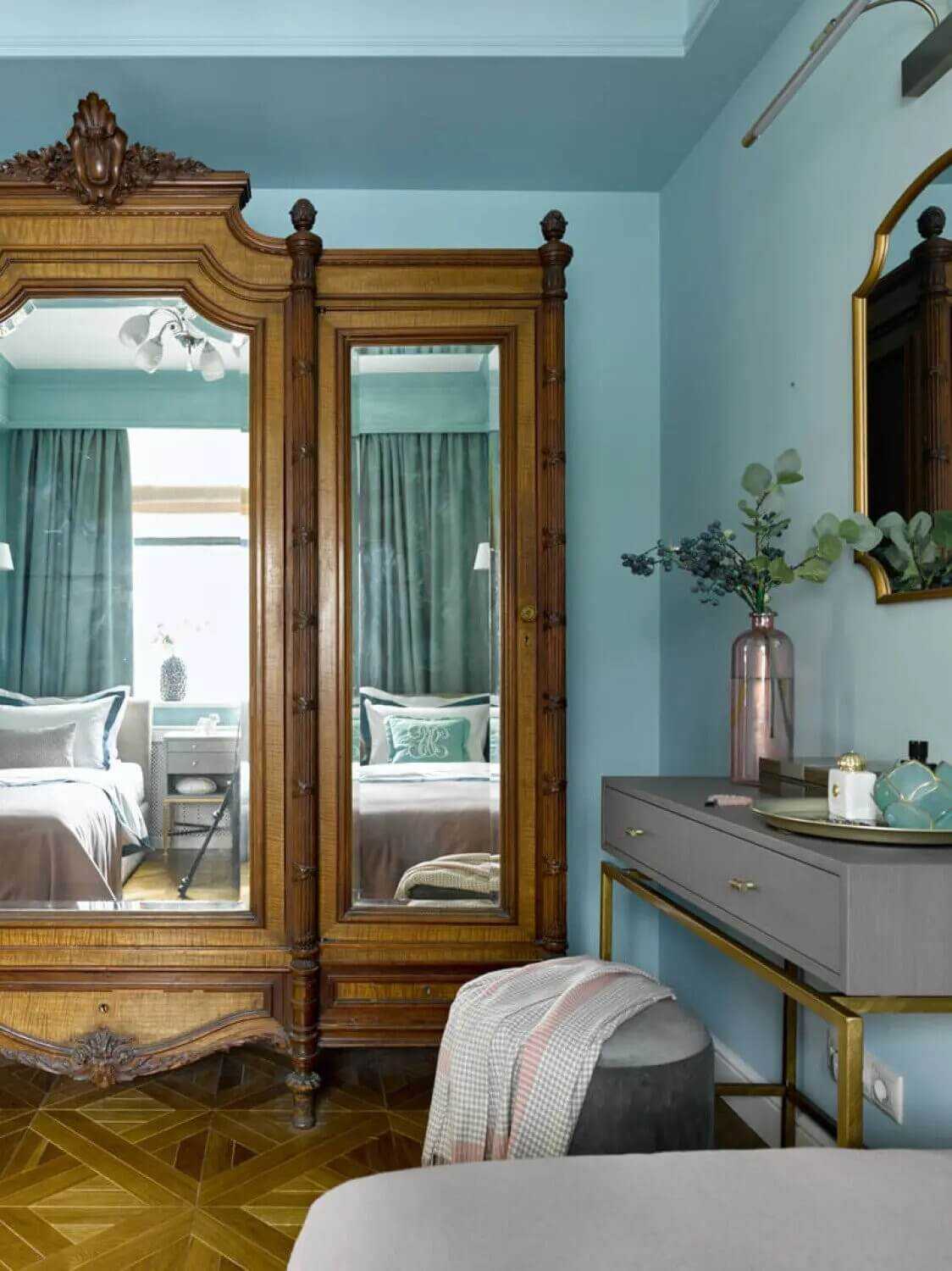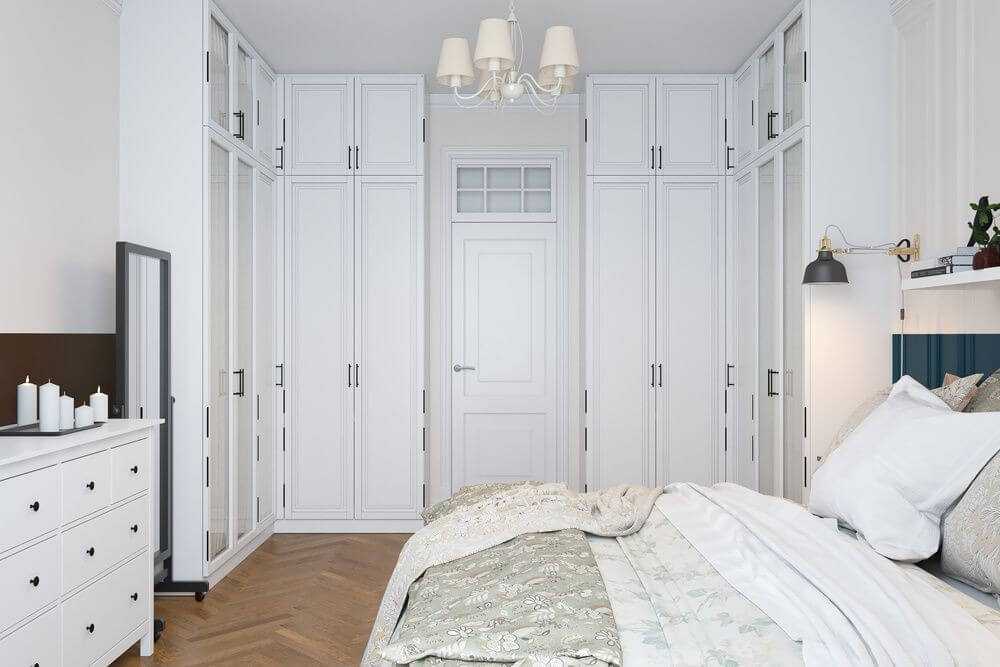 За счёт высоких потолков шкафы в спальне можно сделать узкими, что позволит сберечь пространство комнаты. Дизайнер Марина Моренкова