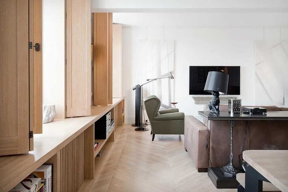 Подоконники в гостиной виртуозно переделаны: внизу расположены полки, где можно хранить книги, а на самом подоконнике можно их читать, расположившись с комфортом. Проект квартиры на Фрунзенской в Москве дизайнера Павла Железнова