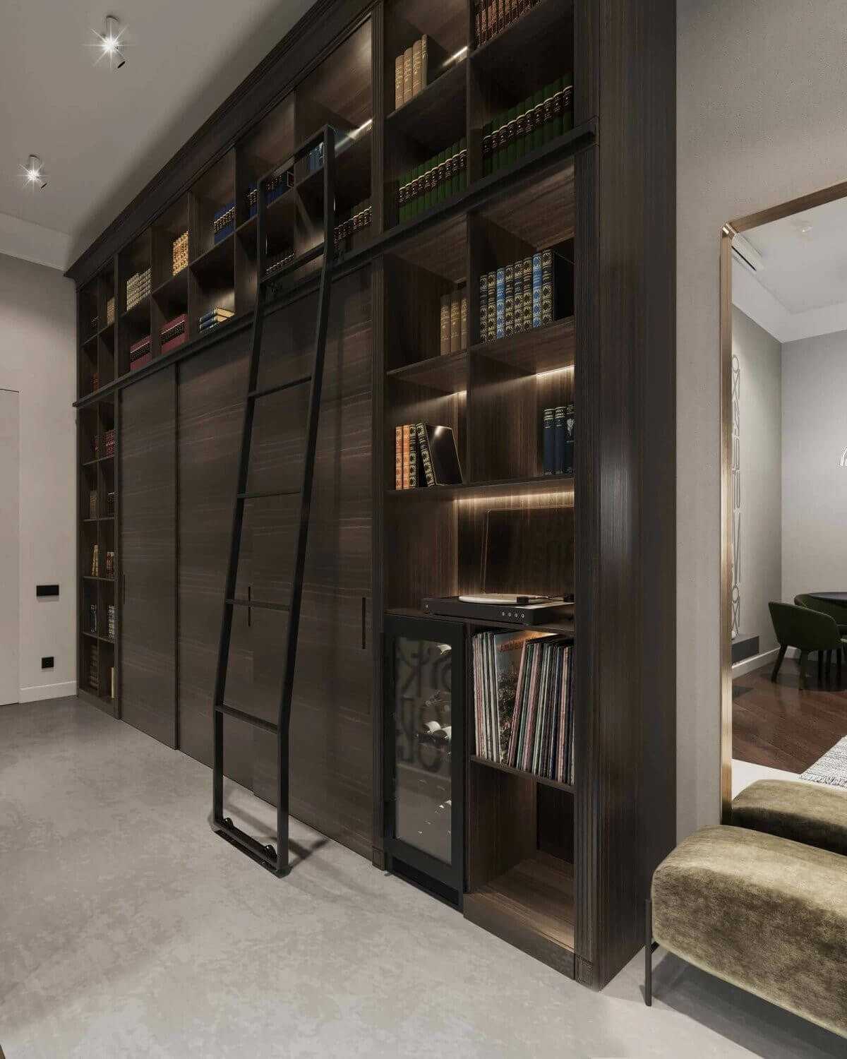 Наверное, каждая семья, проживавшая в сталинском доме, имела большую коллекцию книг. Книжный стеллаж до потолка — то, что может позволить себе владелец такой квартиры, а лестница у шкафа — это стильное напоминание о симпатичном букинистическом магазинчике где-нибудь в восточной части Берлина. Проект квартиры на Якиманке, студия дизайна 22etazh