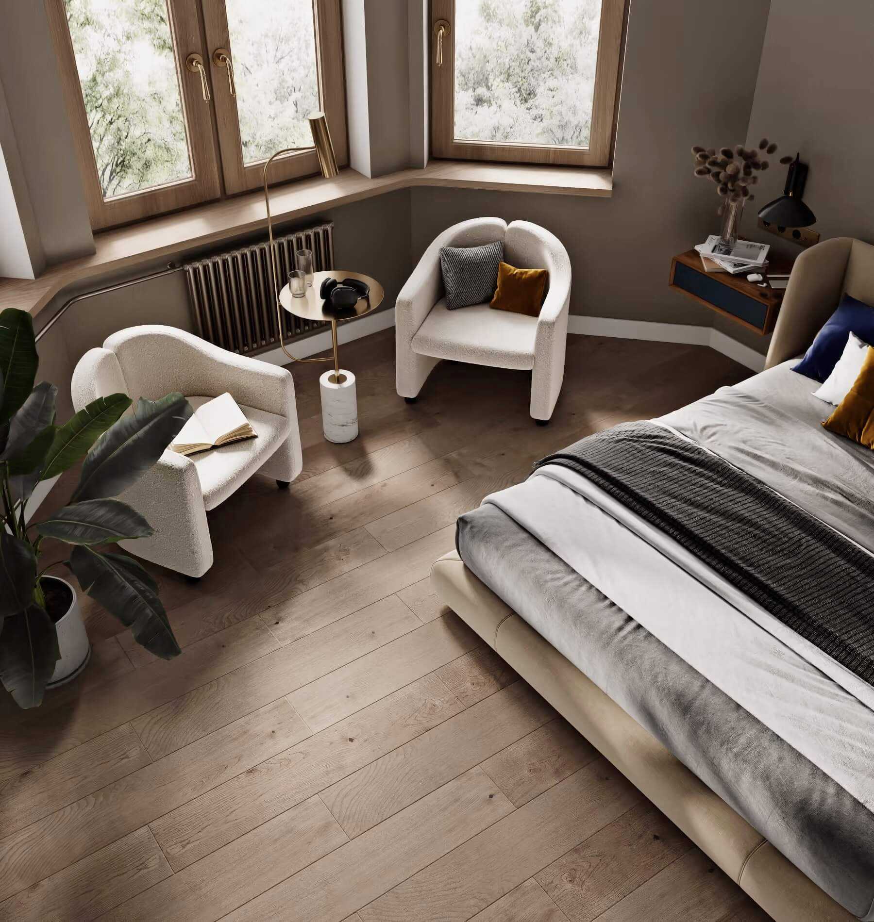 Просторная спальня с огромным эркерным окном. «Сталинка» на северо-западе Москвы, 83 м², дизайнерское бюро Puro