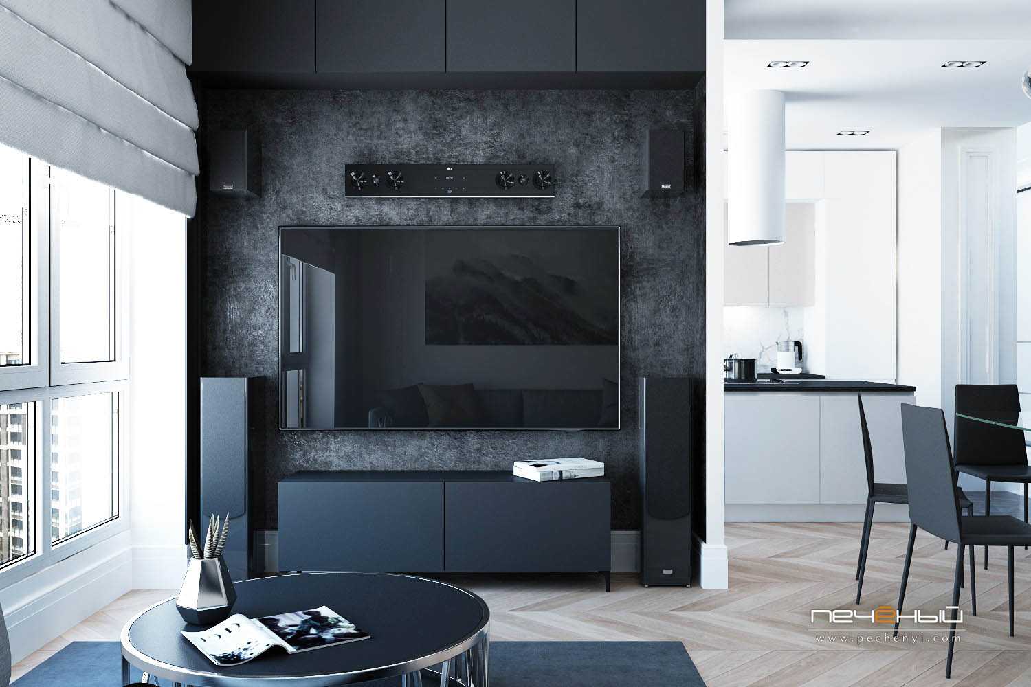 1. Если площадь кухни позволяет вместить диван с телевизором, то это отличный вариант для разделения гостиной и спальни. При такой планировке можно дополнительно отделить перегородкой и детскую