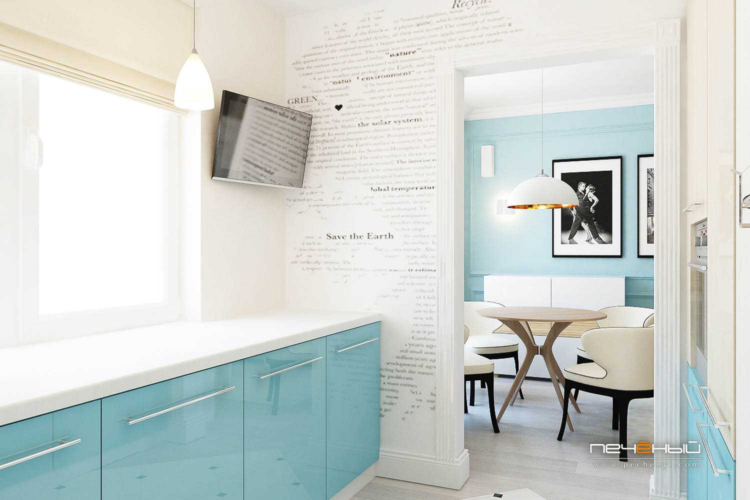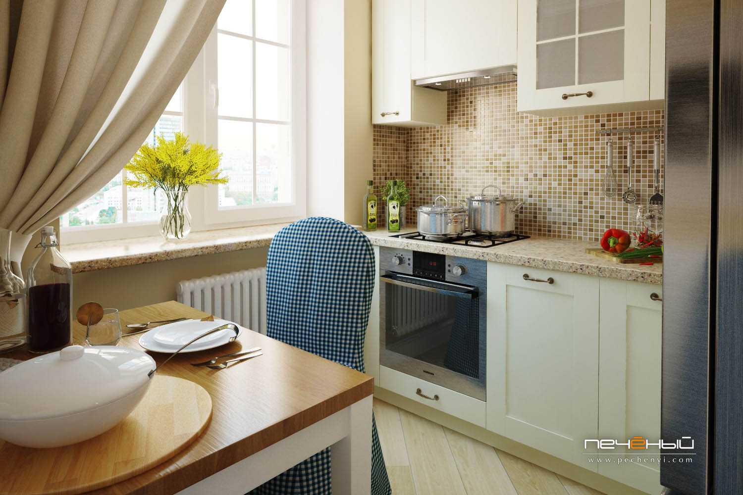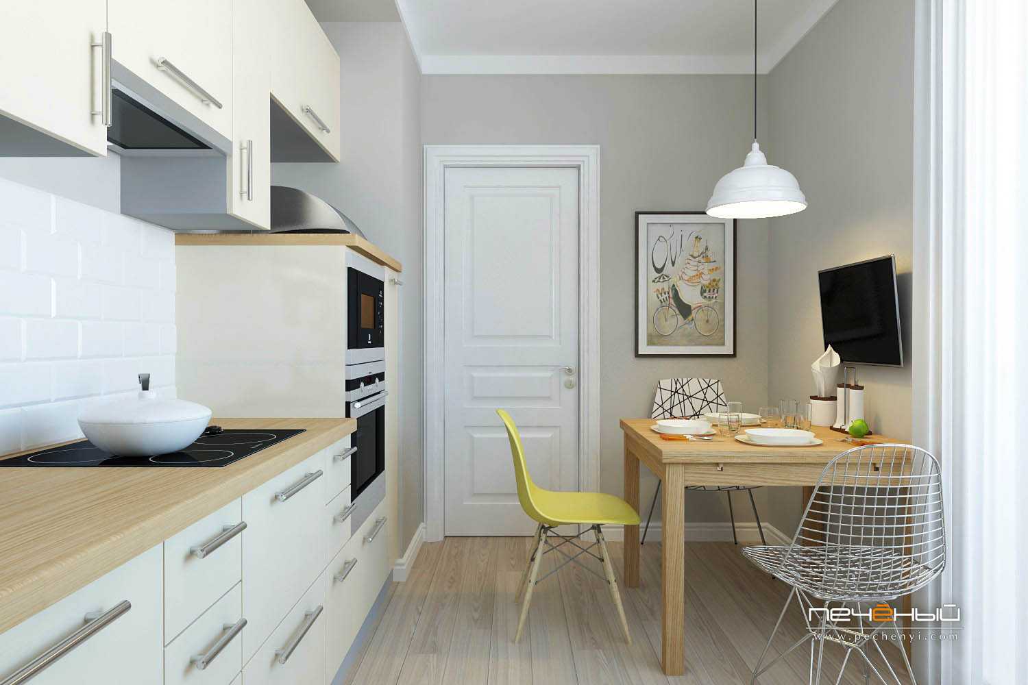 Еще один вариант кухни малышки. Посмотрите, как чехлы на стульях изменили настроение интерьера. С табуретками все было бы иначе.